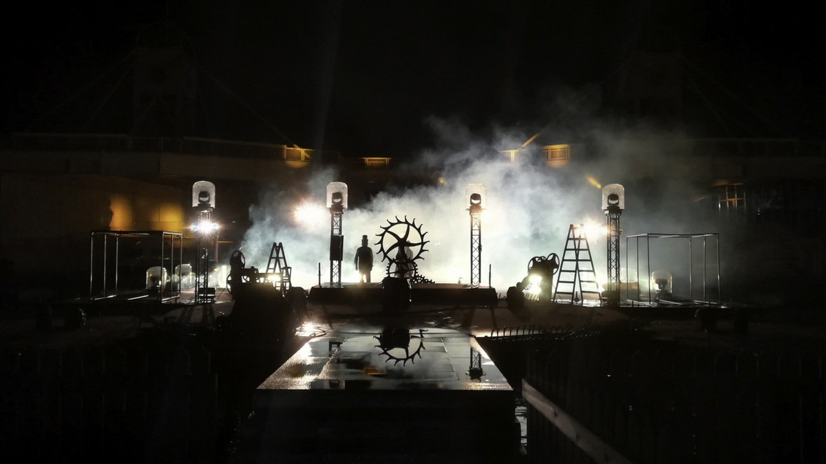 The spectators are in for an over an hour-long experience, a journey back to the past enabled by a number of effects, including fire effects, or a video projection on a water wall. Inventions from the steam engine to the previously mentioned arc lamp, or Tesla's transformer whipping real lightning.