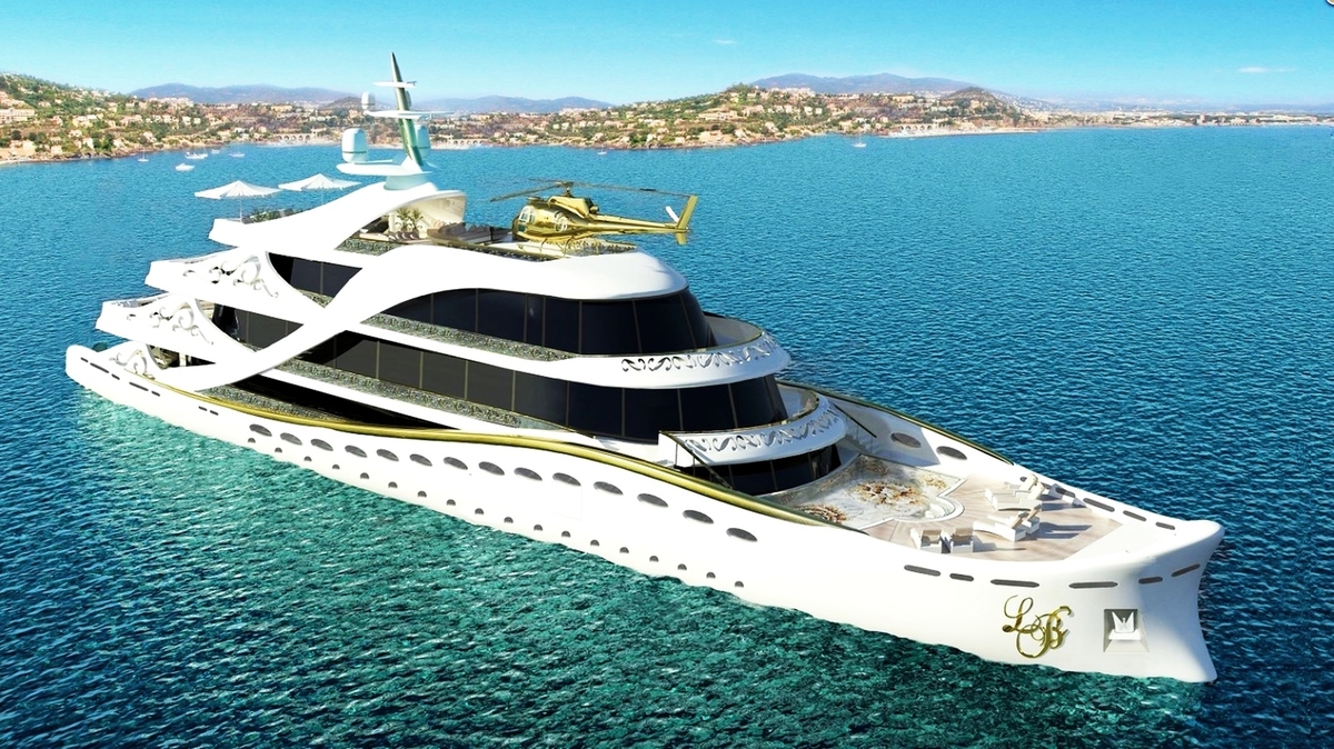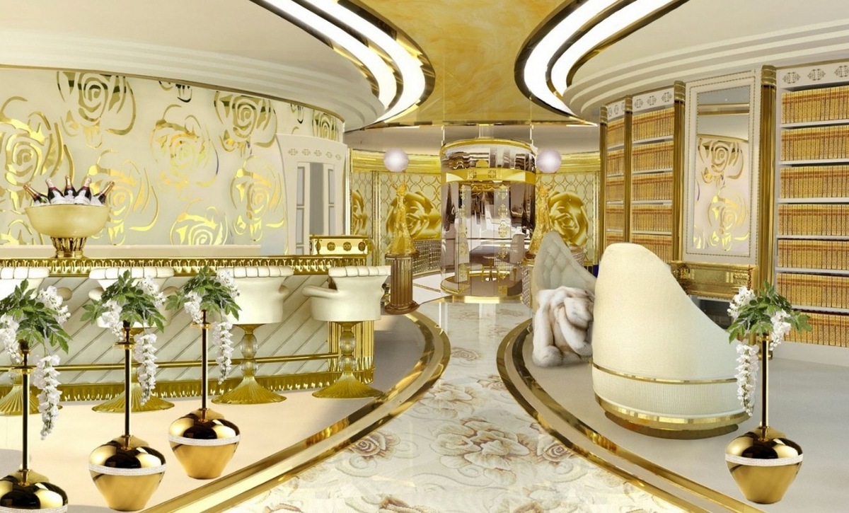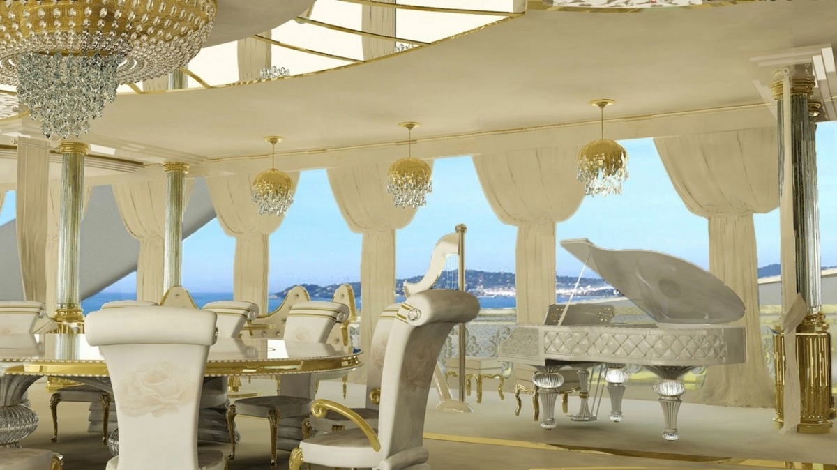 The outdoor areas are sufficiently large for you to feel as free as a bird. Each deck also contains relaxation zones and suntanning decks, while on the main deck is located a swimming pool. The most remarkable idea is a golden helicopter which proudly declares: