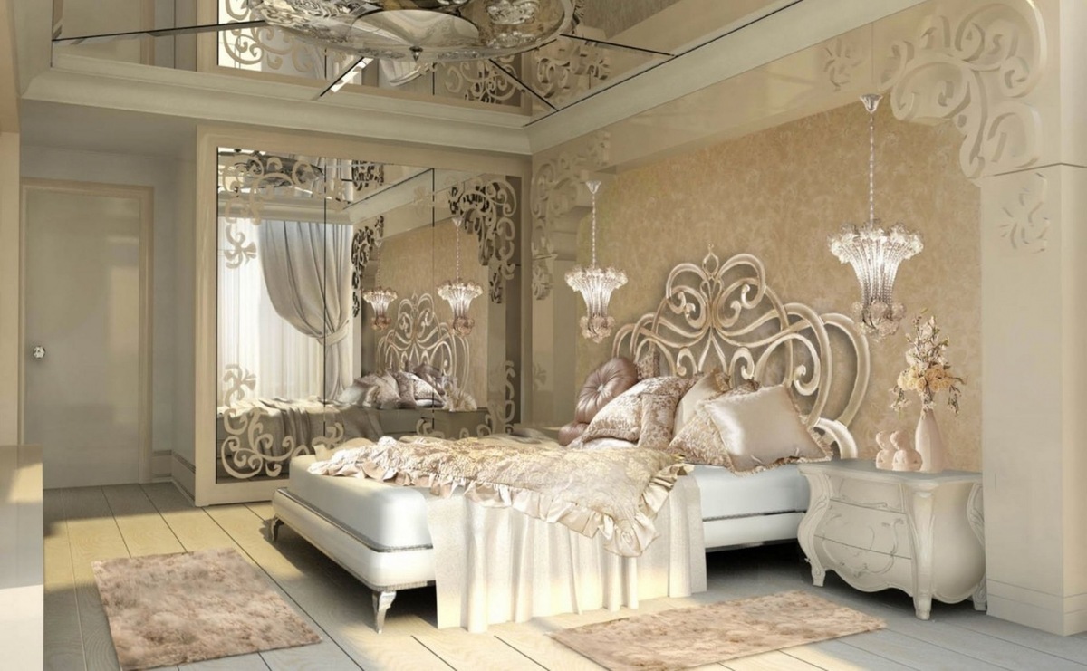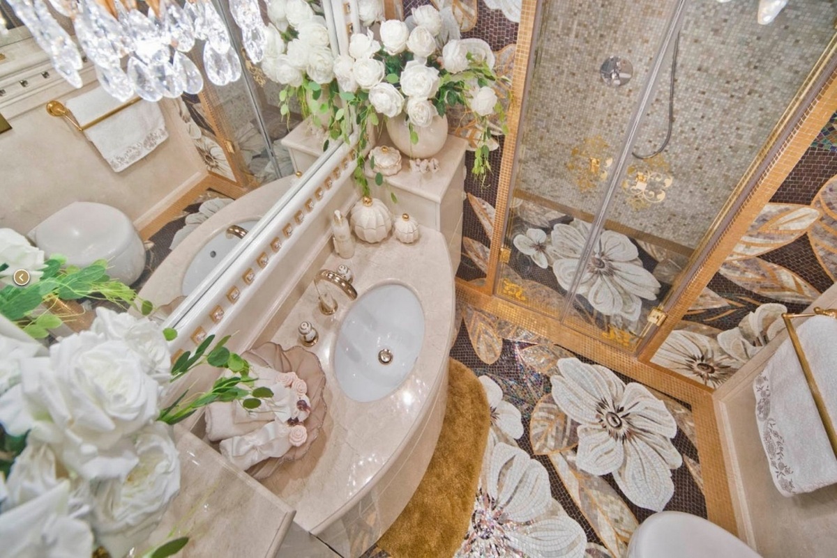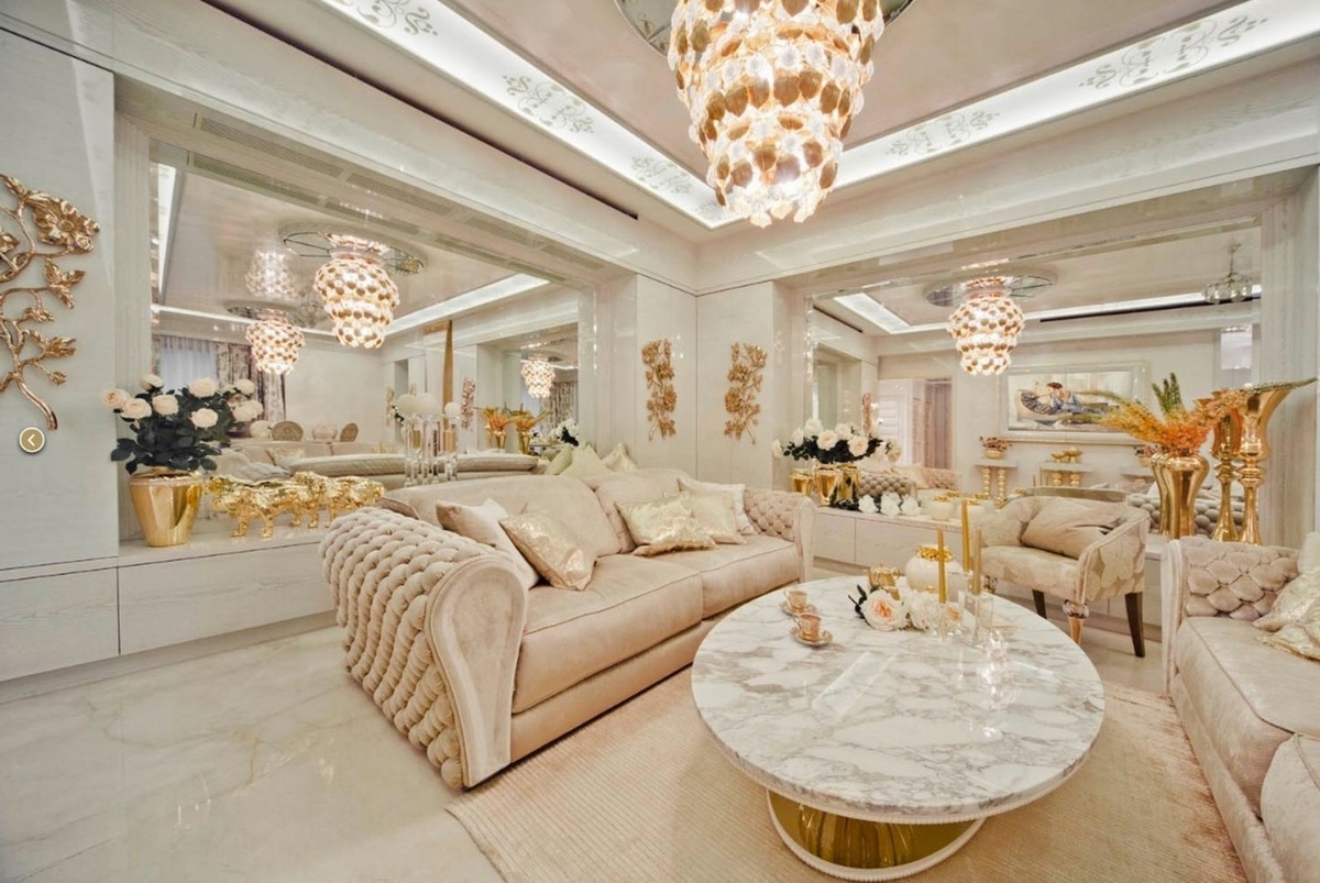 The floor is of different types of marble. White and cream-coloured furniture, big comfortable sofas with embroidered silk and jacquard with beautiful edging. Luxury beds with magnificent front panels. The pillows, blankets, bed linen and hinges are decorated with elegant tassels. Everything is thought-through to the last detail.