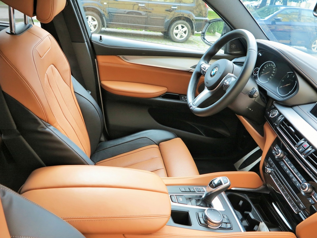 The luxurious BMW X6 xDrive30d car that I have rented can be geared automatically or manually by using the levers on the steering wheel. I have chosen automatic and I’m driving on the Brno highway. The orange and black leather seats are extremely comfortable with the option of adjusting the head, the backs and the leg rests. The basic design of the new BMW X6 is implemented with fabric upholstery but there are also special Design Pure Excellence and Design Pure Experience packages.