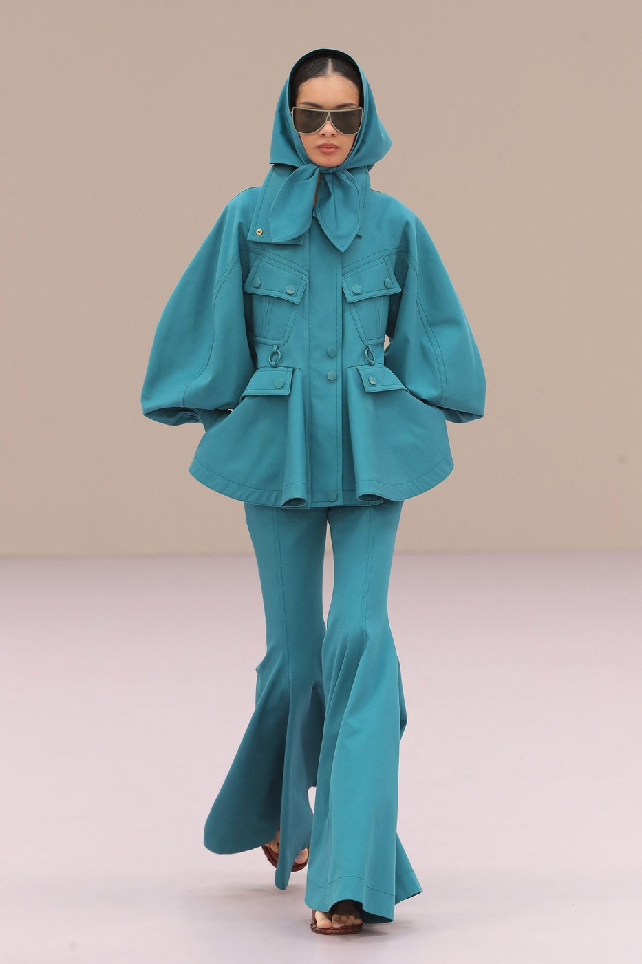 Petroleum blue, wide sleeves and careful adornment will perhaps win everyone over. The entire model was complemented by bell-bottom trousers with a high waist, which has been making a big comeback in recent years. And although many could not imagine discarding their skinny jeans not so long ago, wide trousers are now almost compulsory for everyone's wardrobe.