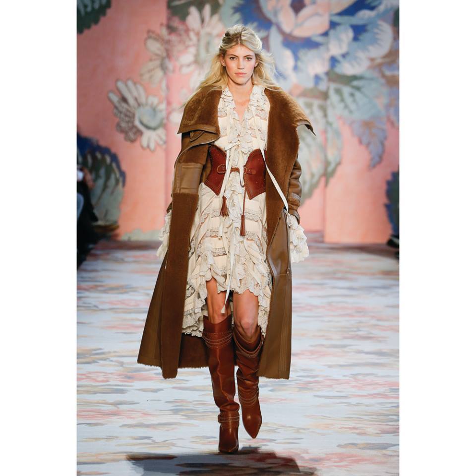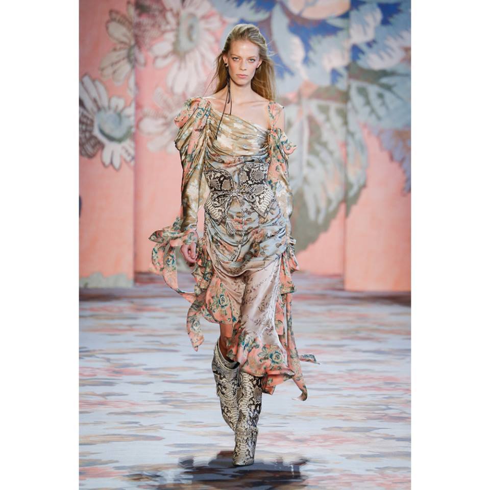 The brilliant collection predominantly consists of earthy tones, such as brown, nude, beige, grey or white, but there also appears red or the essential symbol of romance - flowers. Romantic florets grace tops, dresses or trouser suits. The Wild West was projected into the collection by means of luxurious cowboy boots, prerequisite leather accessories or black hats elegantly tied around the shoulders of some models.