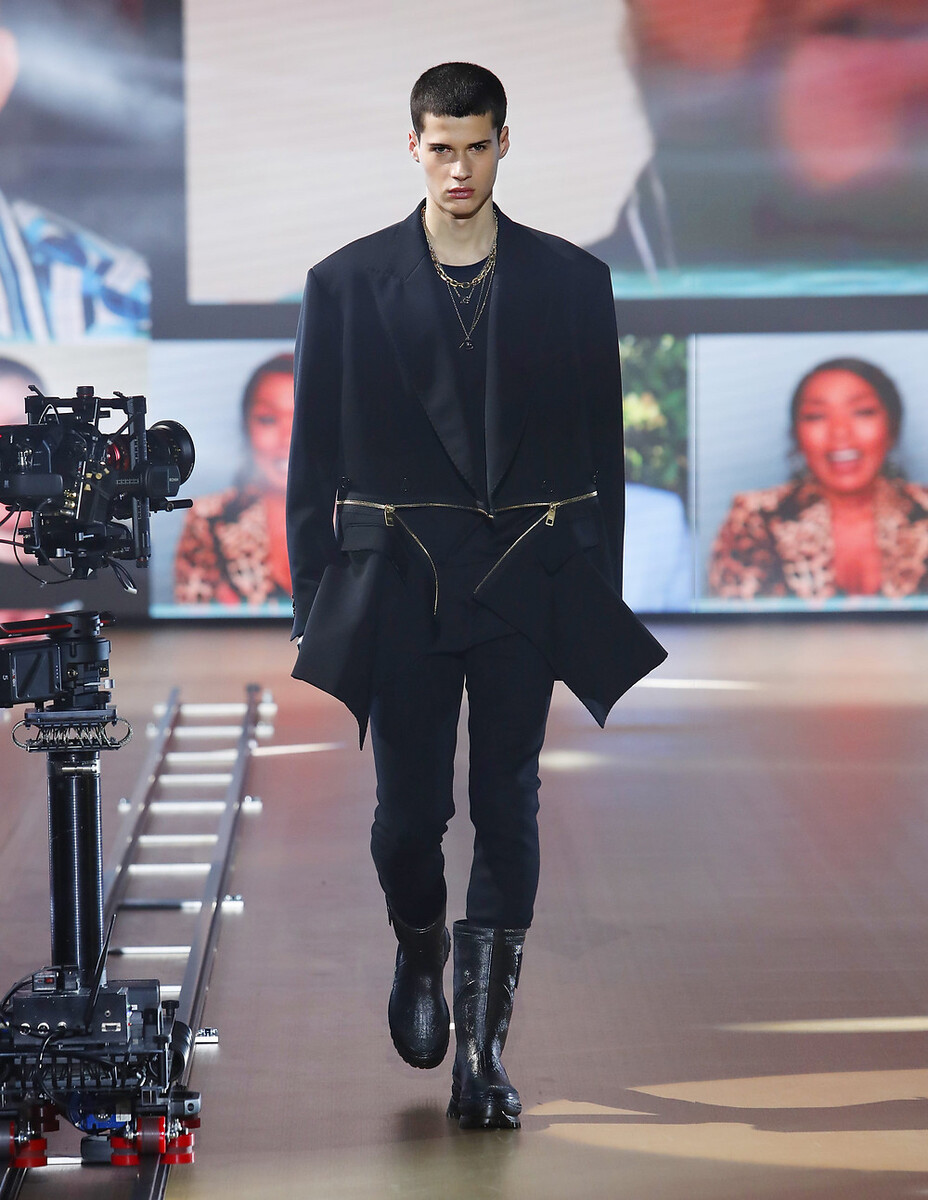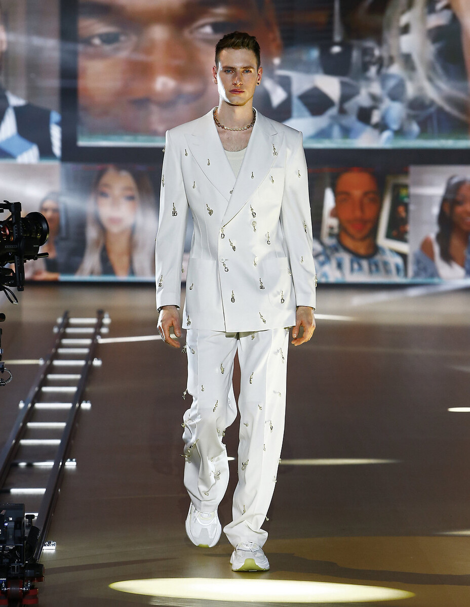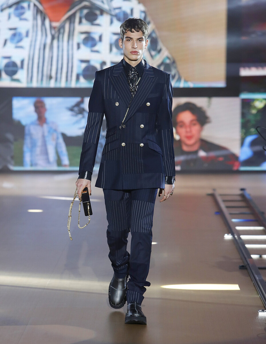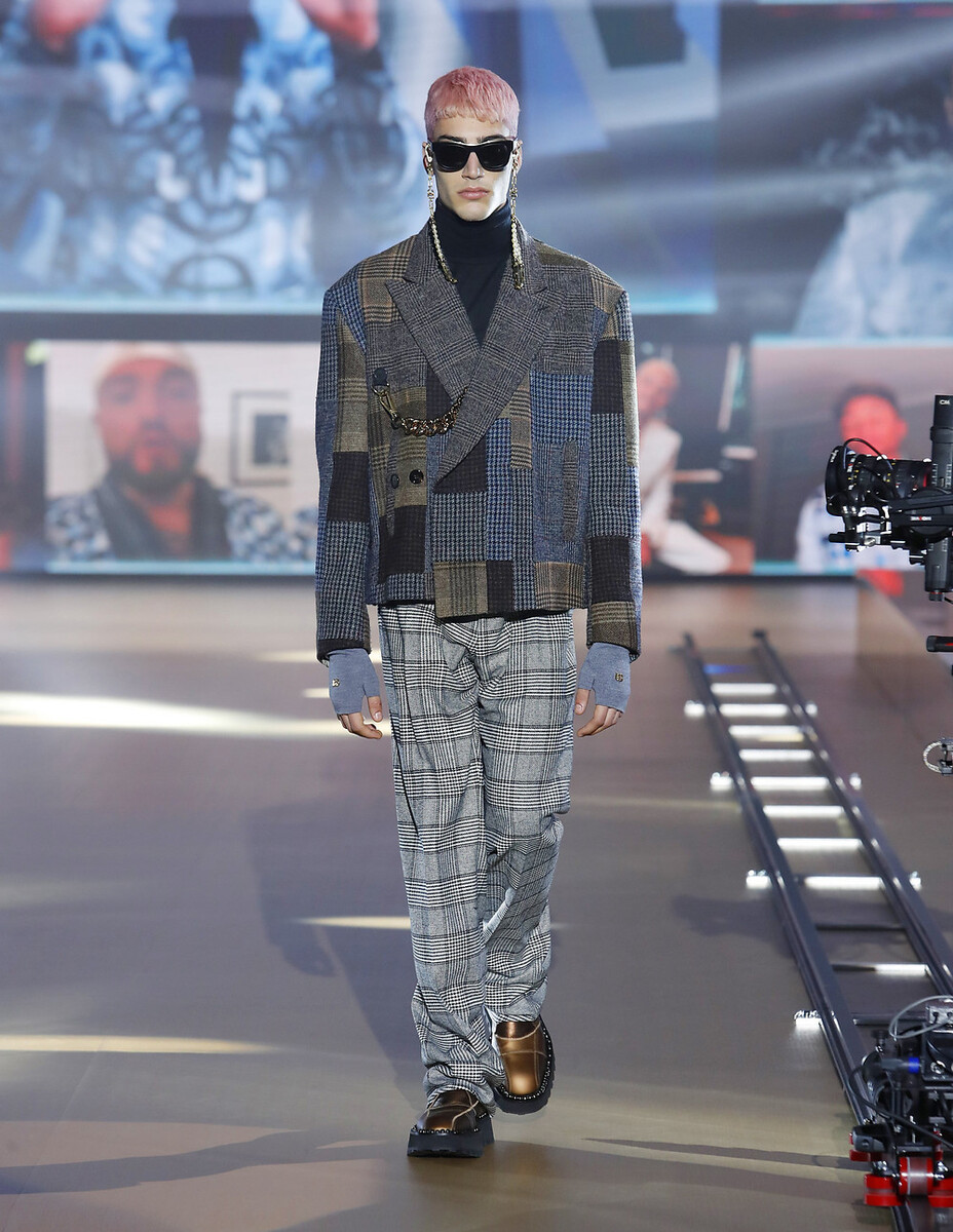 Hearing Dolce & Gabbana I can’t help but remember their Sex and the City fashion show, where Carrie Bradshaw, wearing nothing but sparkly nude panties and a revealing blue coat takes a fall right on the catwalk. However, being Carrie, she musters the courage to get back up and keep going – just as always. And courage is exactly what you need, if you’re planning to go out in the new Dolce & Gabbana Fall/Winter 2021 menswear collection, which is anything but plain.