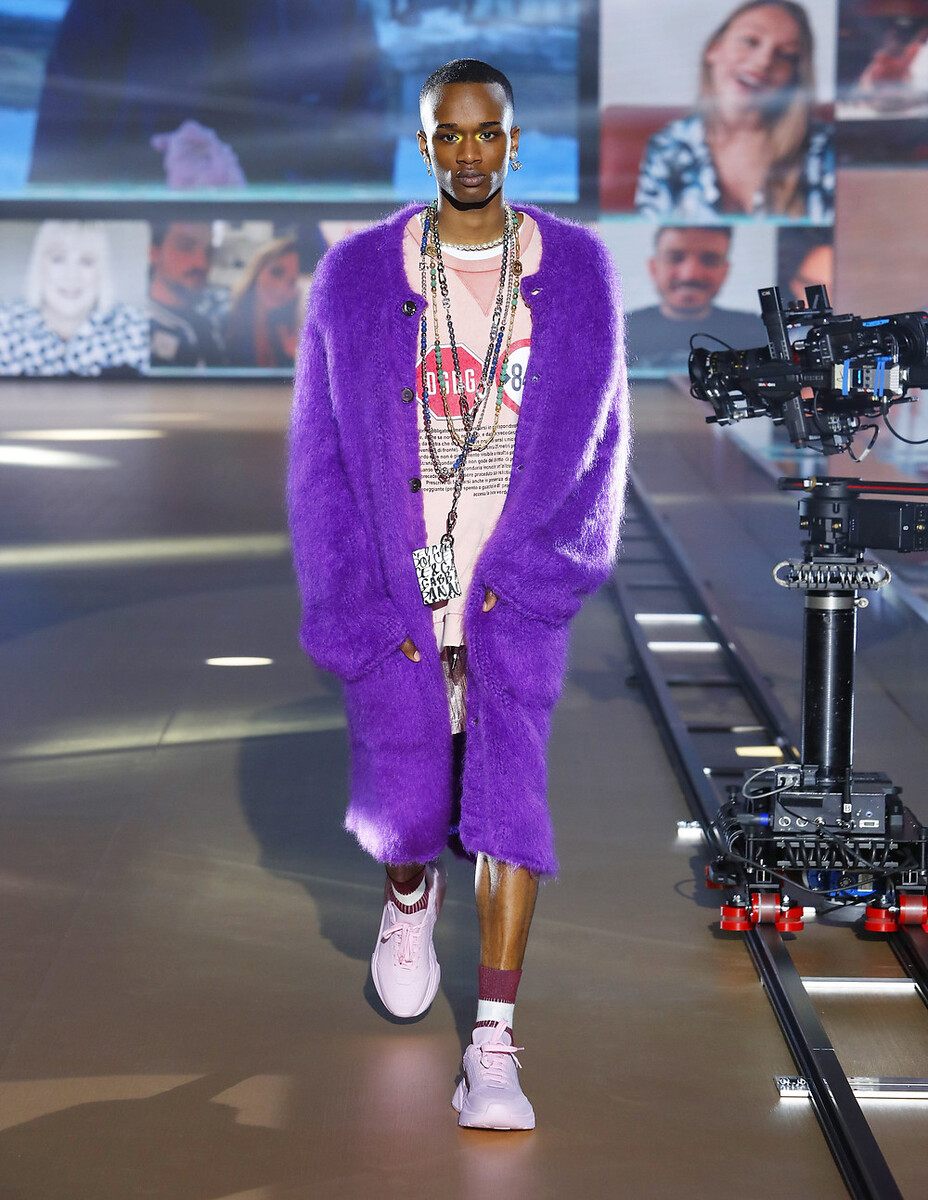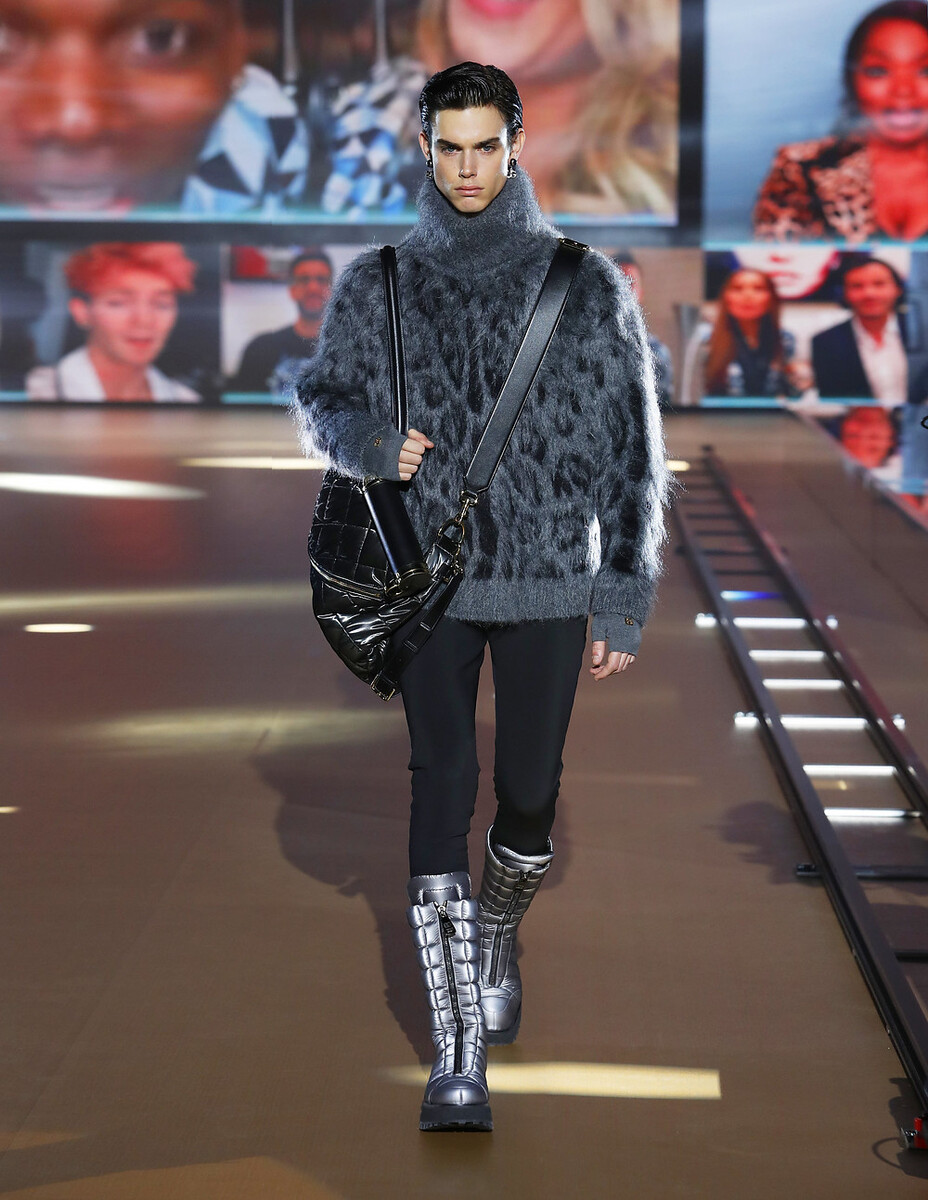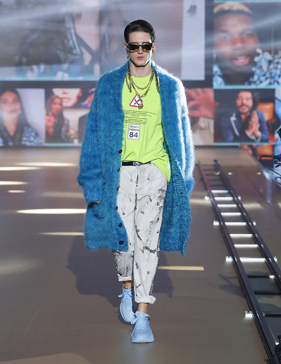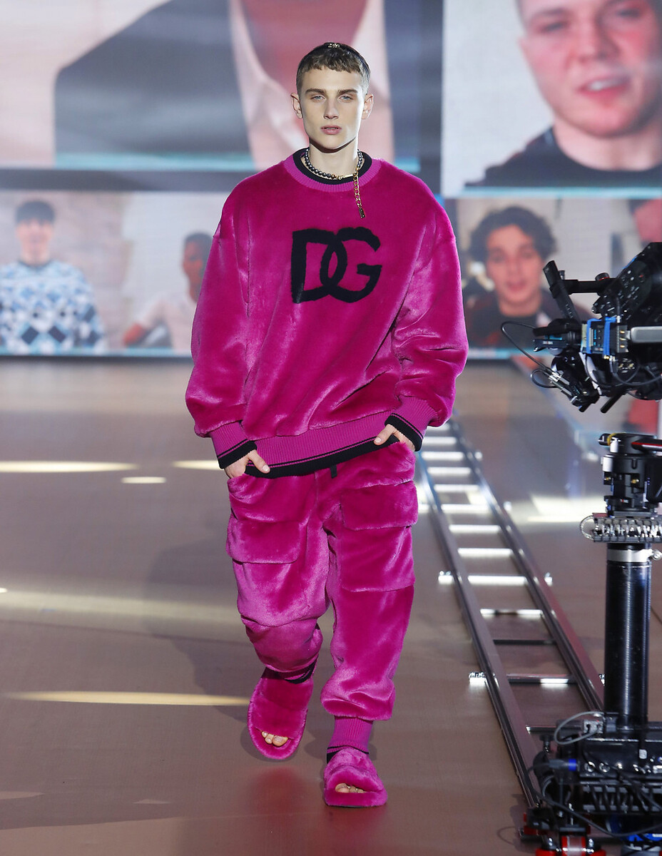 At first glance, the FW2021 collection looks straight out of a teenage fashion catalogue. A rich colour palette, ranging from pink to purple to neon yellow, baseball caps, chains, bombers, sneakers, metallic outfits, knit turtlenecks or a fuzzy pink sweatsuit – all these elements might make you think that Domenico and Stefano are now targetting generations younger by a decade or two. And why wouldn’t they, since a great share of those in their 40s can only dream about the incomes of some Gen Z-ers. That’s not the point of this collection, though.
