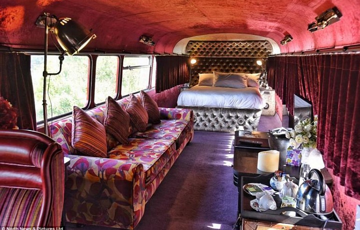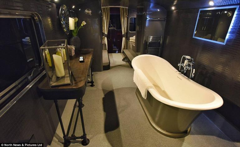 The renovation cost £ 100,000; equipment and amenities include a flat-screen TV and hot-water bath tub. While the lower deck is used as a relaxation zone, the upper one has been transformed in a red velvet romantic bedroom with a comfortable double bed. Guests can also make use of unique dressing gowns made of Egyptian cotton.