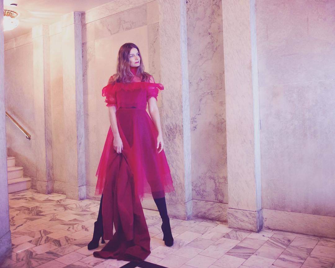 The AW 18/19 collection is inspired by the prosperous Victorian period. Playful and original, such are the collections of the young designer and the current one is no exception! At the introduction of the show, violoncellist, Terezie Kovalová appeared in a black gown; she then accompanied the luxurious evening by her play. The fashion show itself was opened up by Ukrainian Alina Baikova in an absolutely stunning model, wearing a bordeaux-coloured fur and a black gown with cutouts and a high vent.