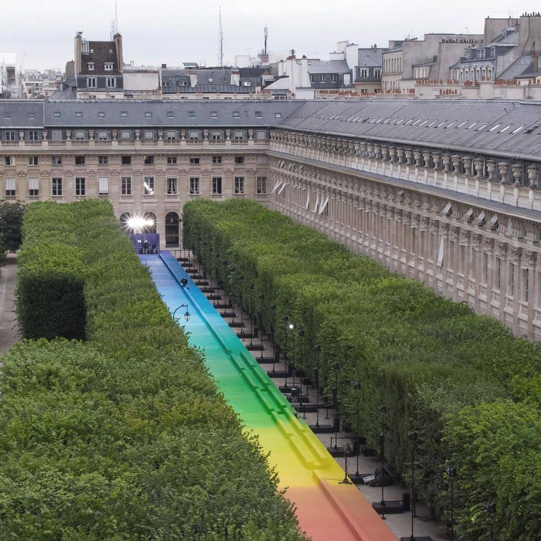 The luxurious show which took place in the historic Palais Royal, established in the 17th century by Cardinal Richelieu, was opened up by a sweep of snow-white. Seventeen such models preceded the moment when on the rainbow-coloured catwalk appeared outfits of earthy hues, then changing into bold colours and patterns. And in that moment it was clear: