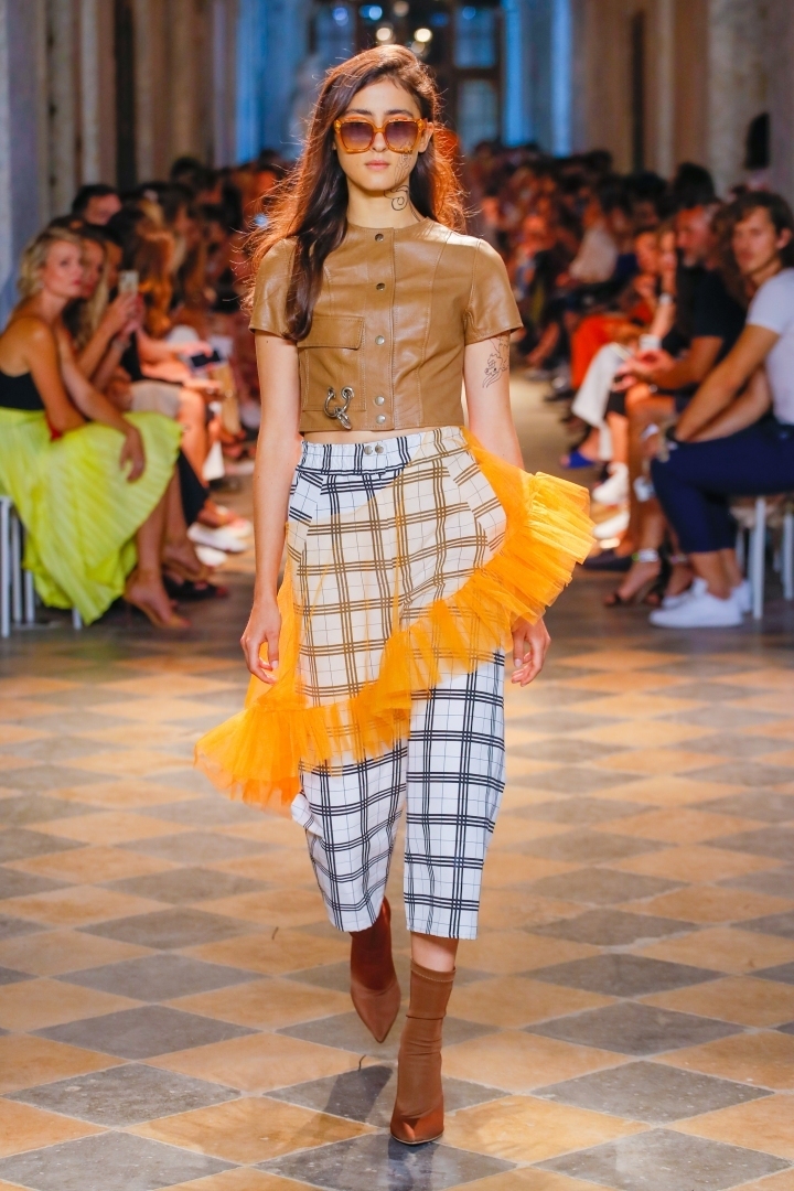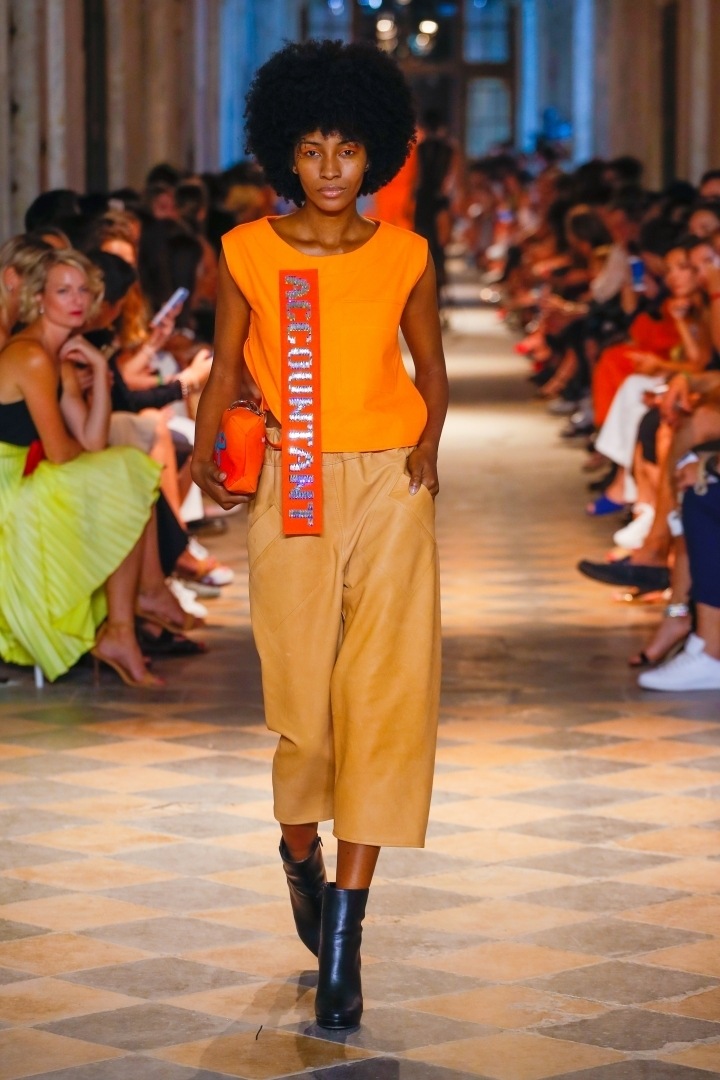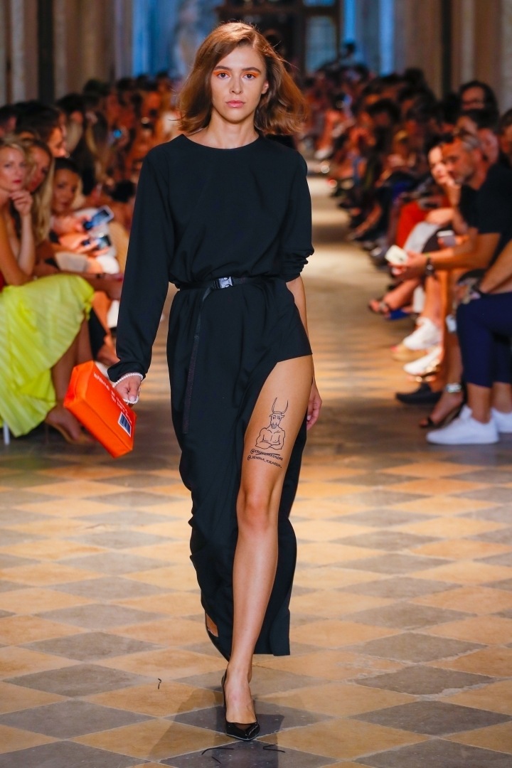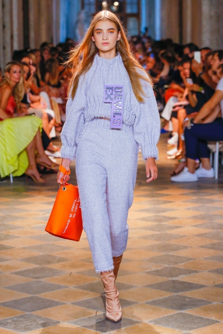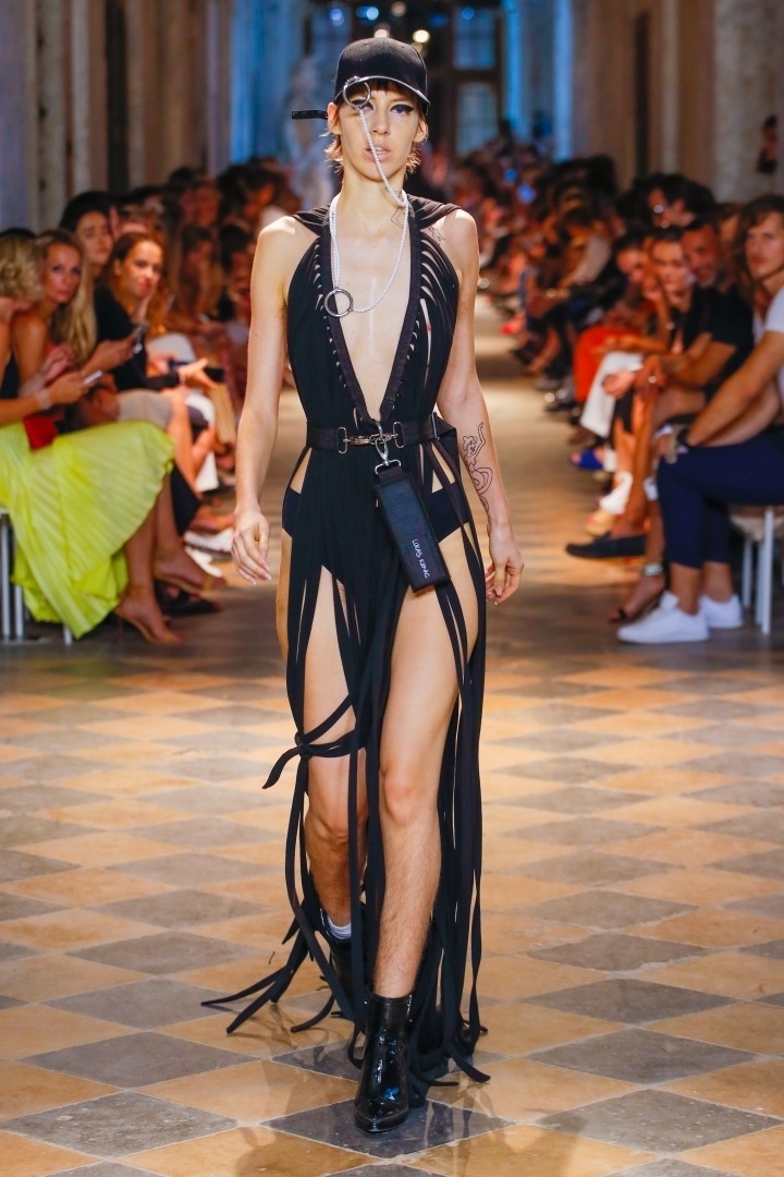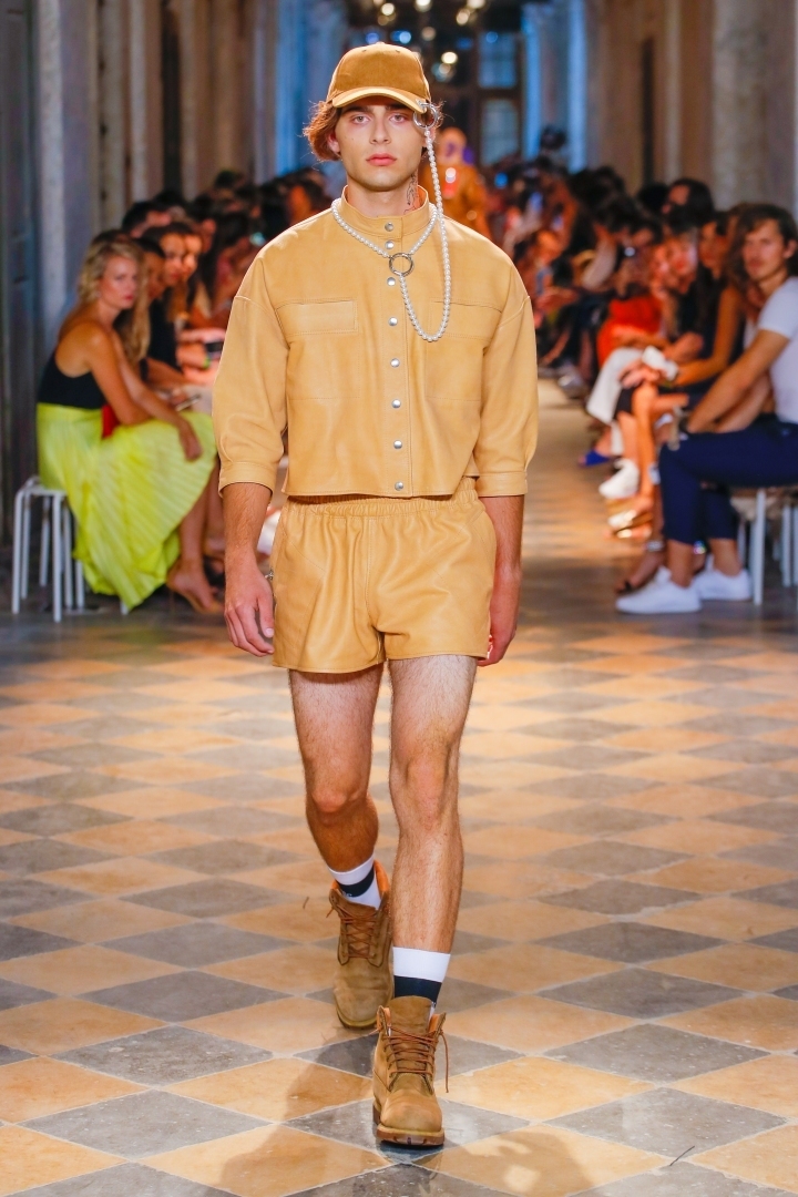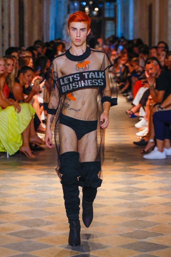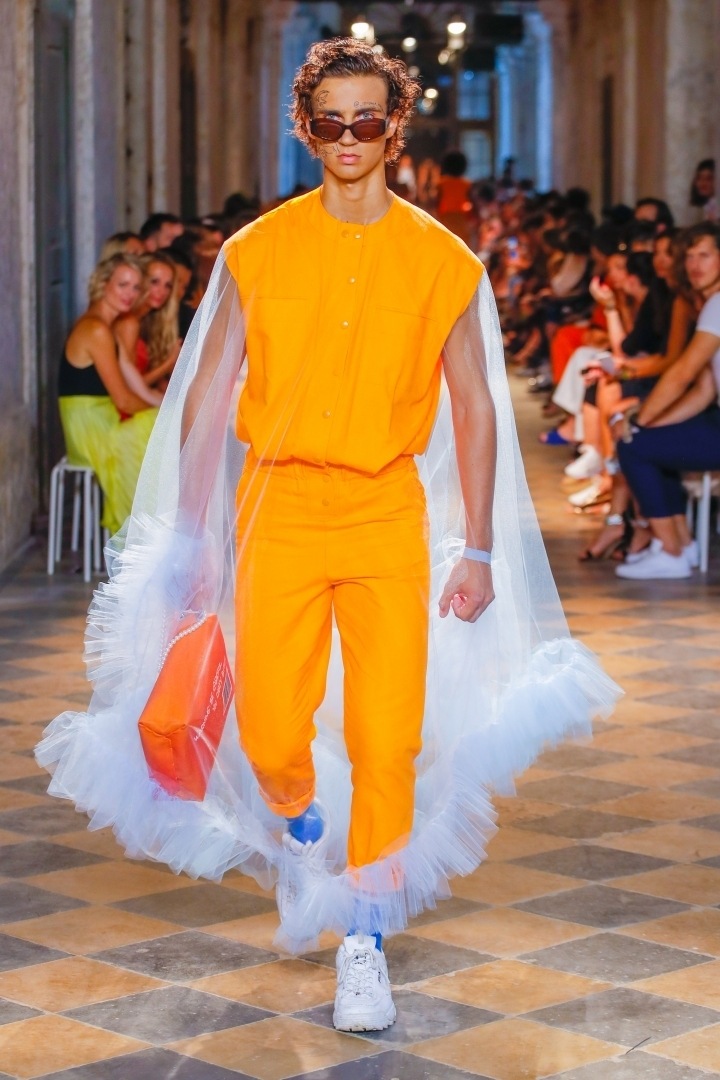 The luxurious SS20 collection contains a surprising number of minimalistic pieces that the designer always chose to elevate with a particular detail - an orange men's jumpsuit was decorated with a meter of tulle, a blue jumpsuit with a SOLD sign, a black top with a metal buckle.