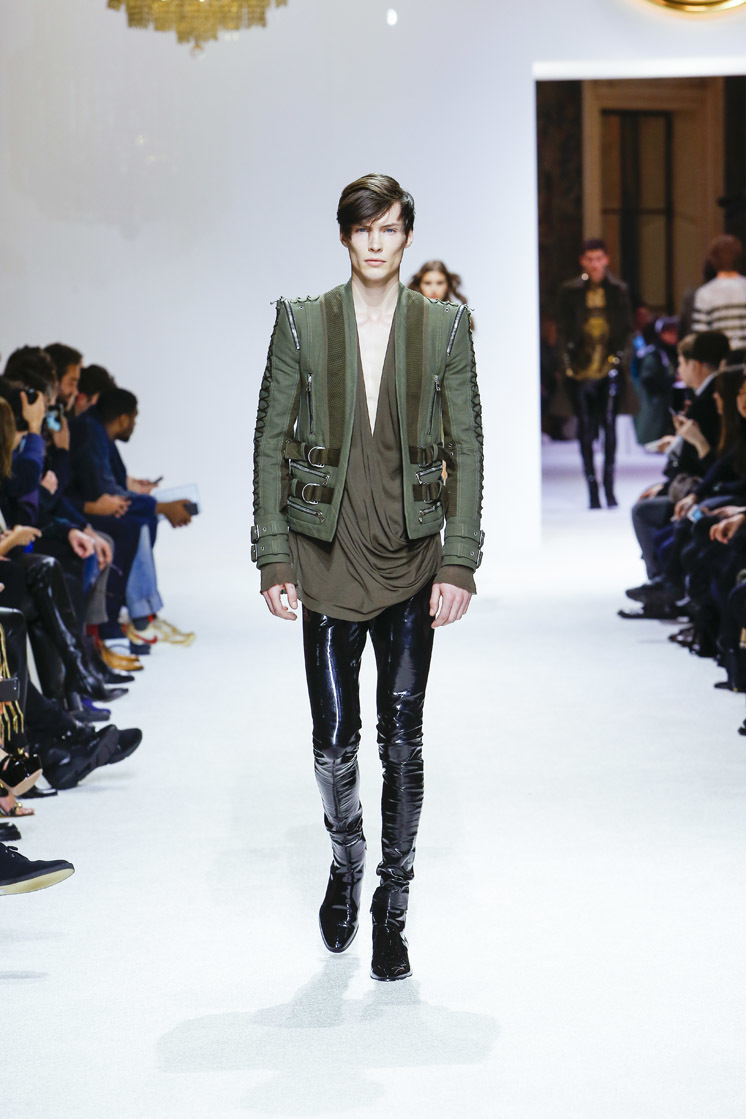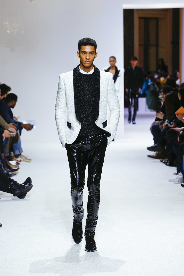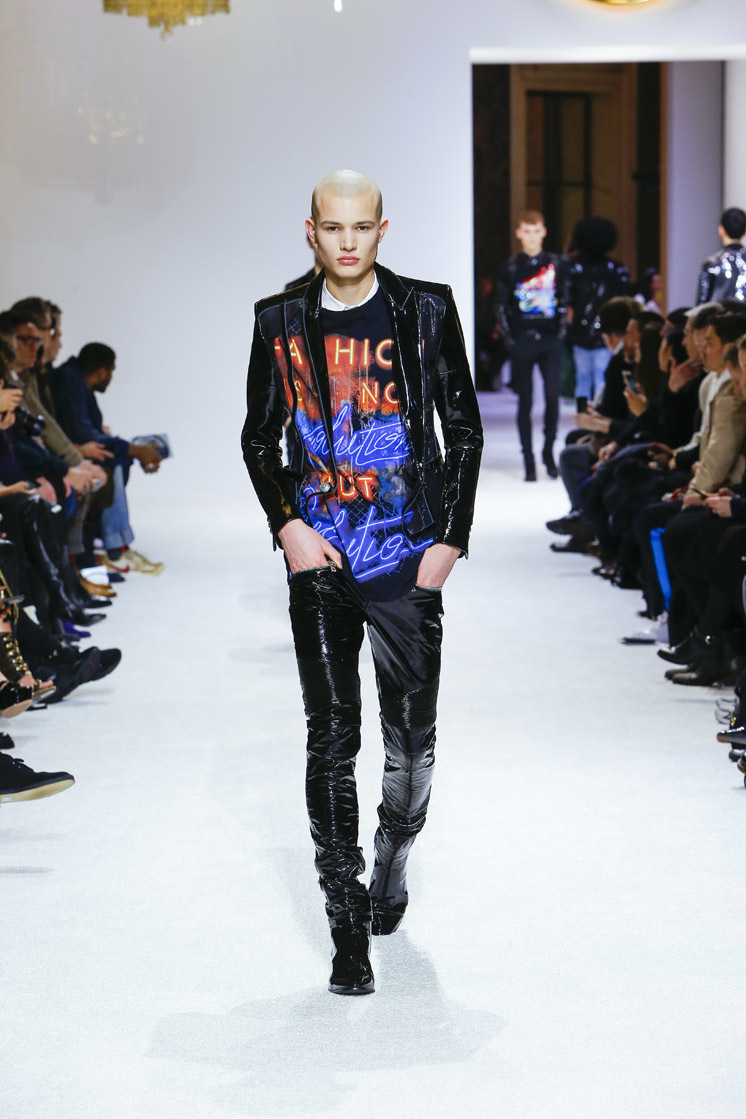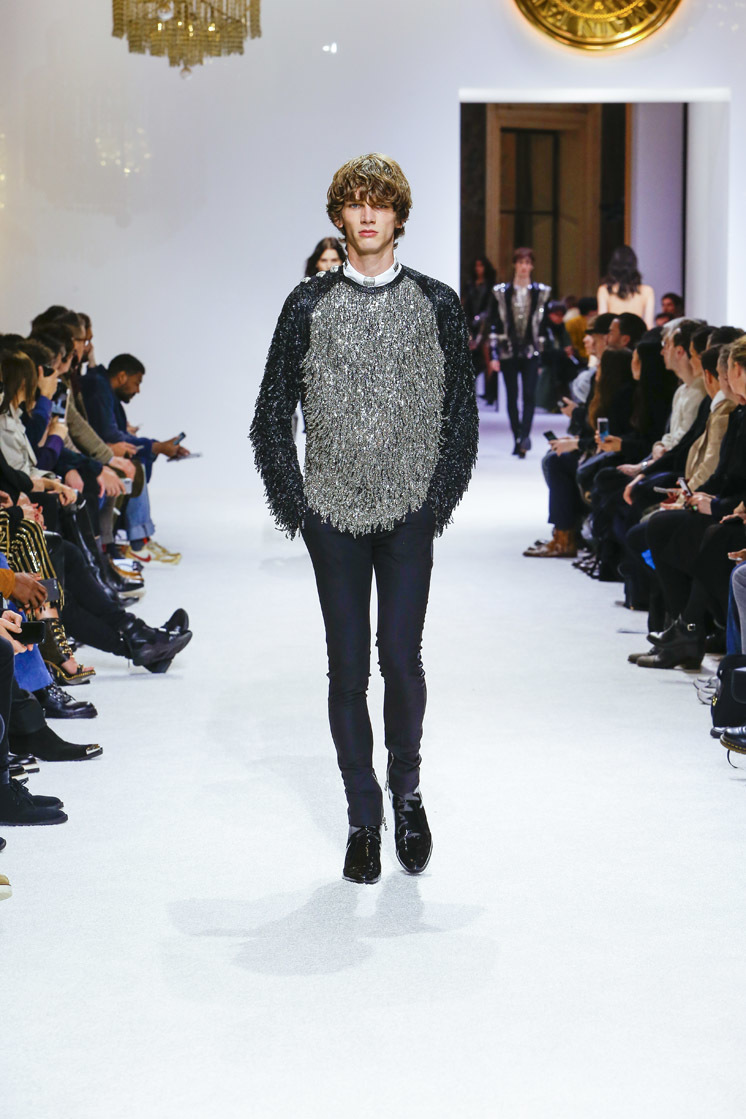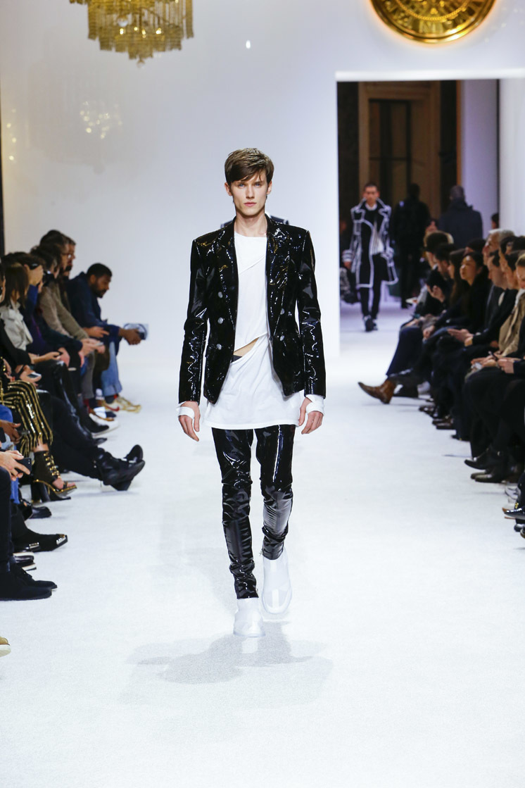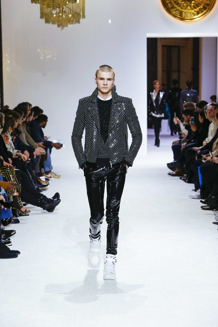 The luxury collection contains unique pieces of precise craftsmanship, bold decorations and top-quality tailoring. The models are decorated with embroidery, metal, chains, shine and sparkle and as regards materials, Olivier Rousteing reached for example for artificial leather, paracord, jersey, nylon or PVC. PVC was actually the material of majority of trousers which appeared on the catwalk.
