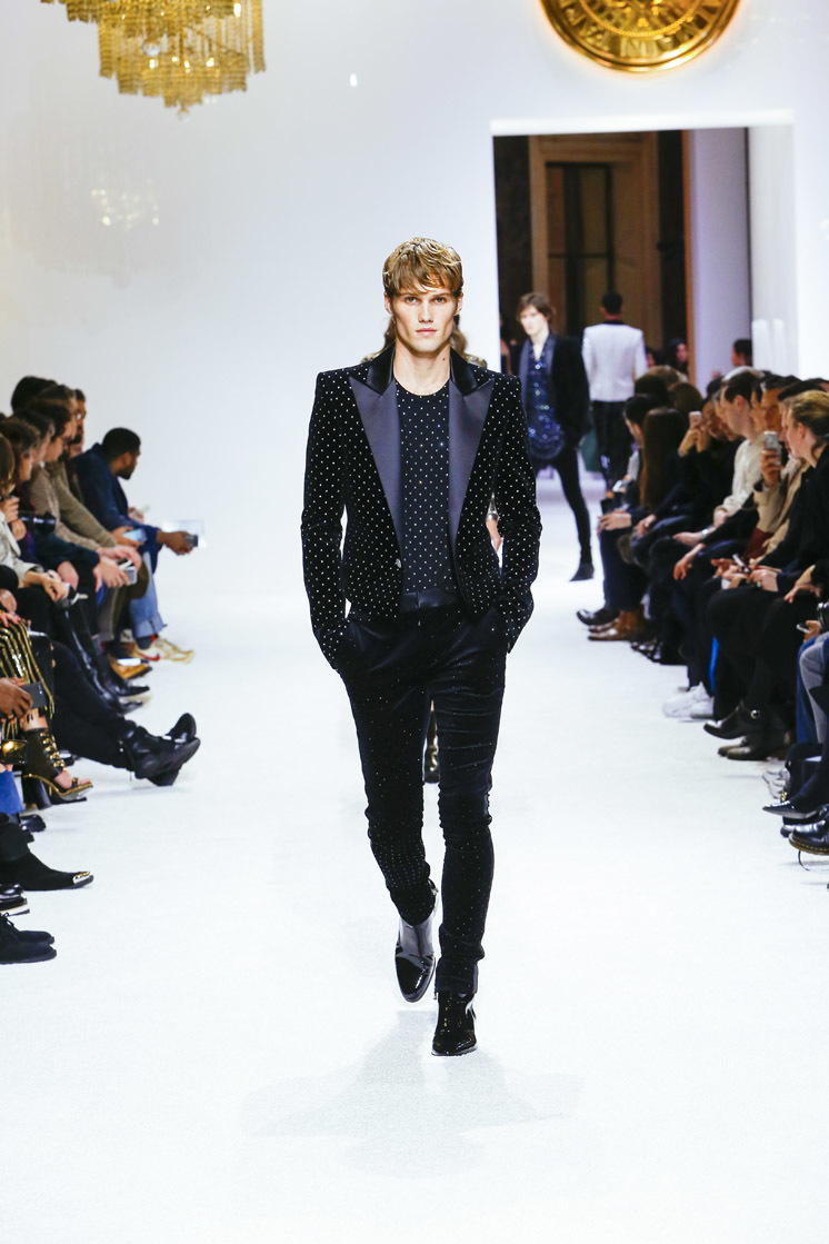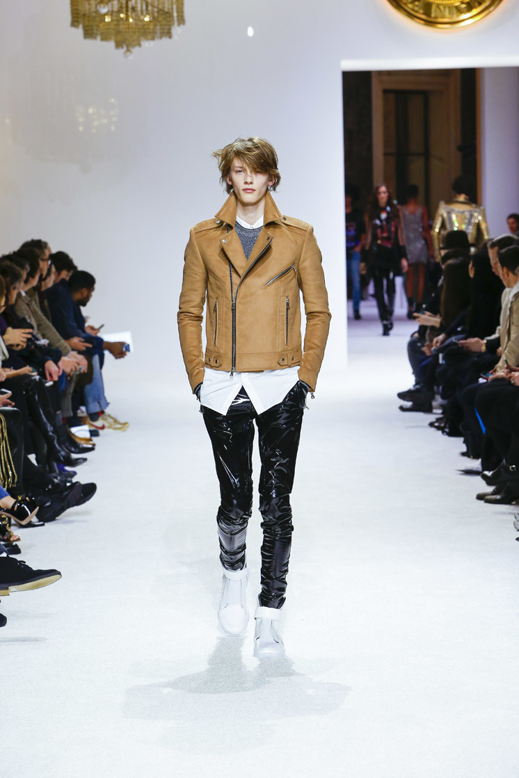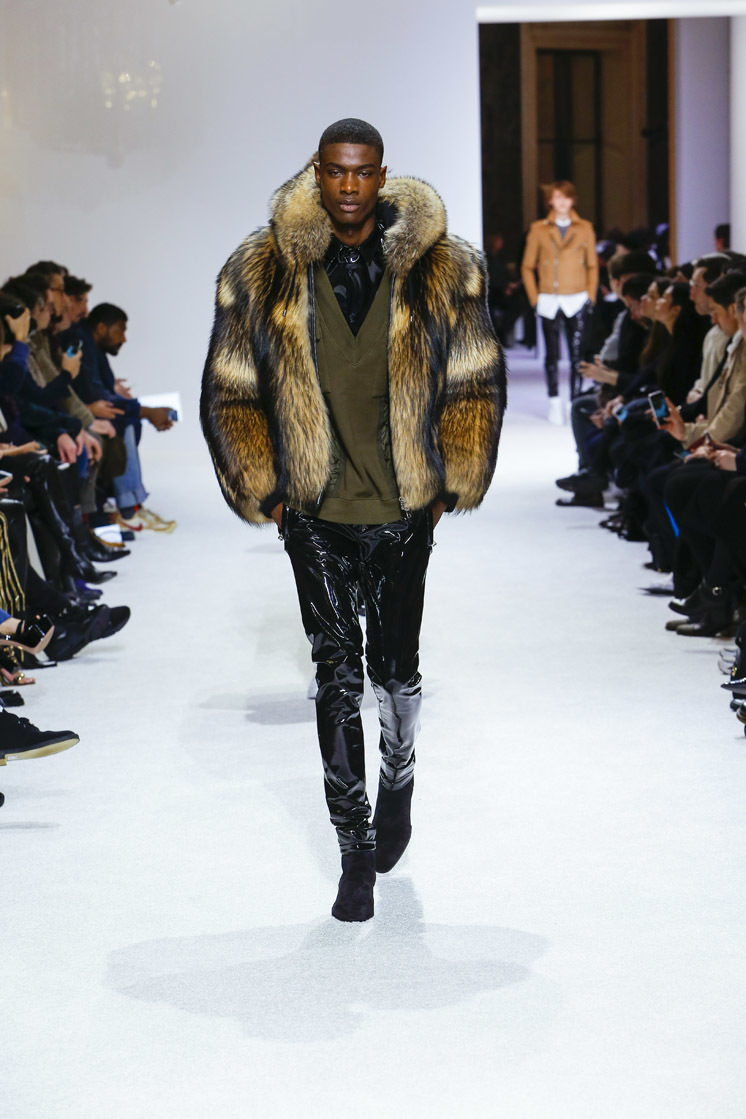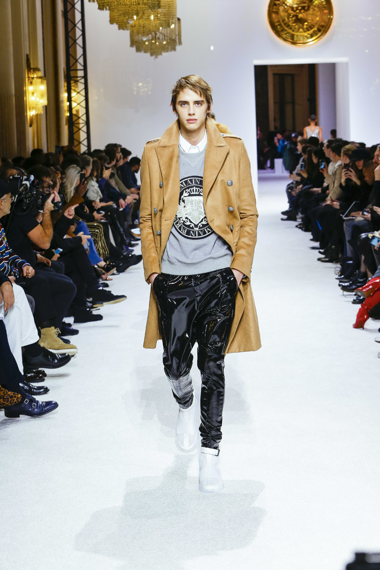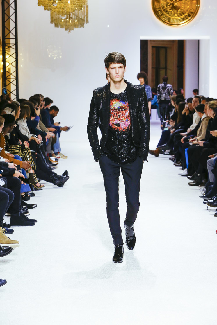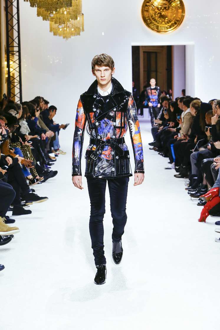 The luxury collection contains unique pieces of precise craftsmanship, bold decorations and top-quality tailoring. The models are decorated with embroidery, metal, chains, shine and sparkle and as regards materials, Olivier Rousteing reached for example for artificial leather, paracord, jersey, nylon or PVC. PVC was actually the material of majority of trousers which appeared on the catwalk.