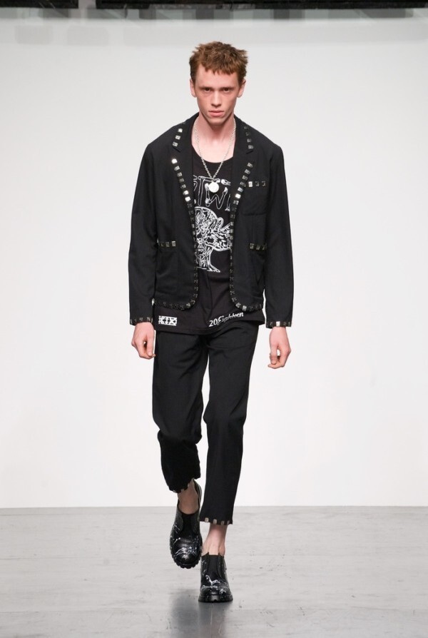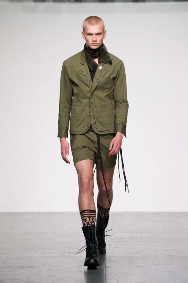 The show included in particular bomber jackets, sleeveless jean jackets paired with short shorts of various lengths. The predominant colours were khaki and black, composed of embroidered leather accessories and top wear made of camouflage printing paper, all held together by shiny silver staples. KTZ profiled itself as a punk uniform, creating anonymity in the form of scarves and veils. For styling, KTZ matched heels with black pipe socks and delicate chandelier earrings, while blurring the lines of what is feminine and what is masculine.