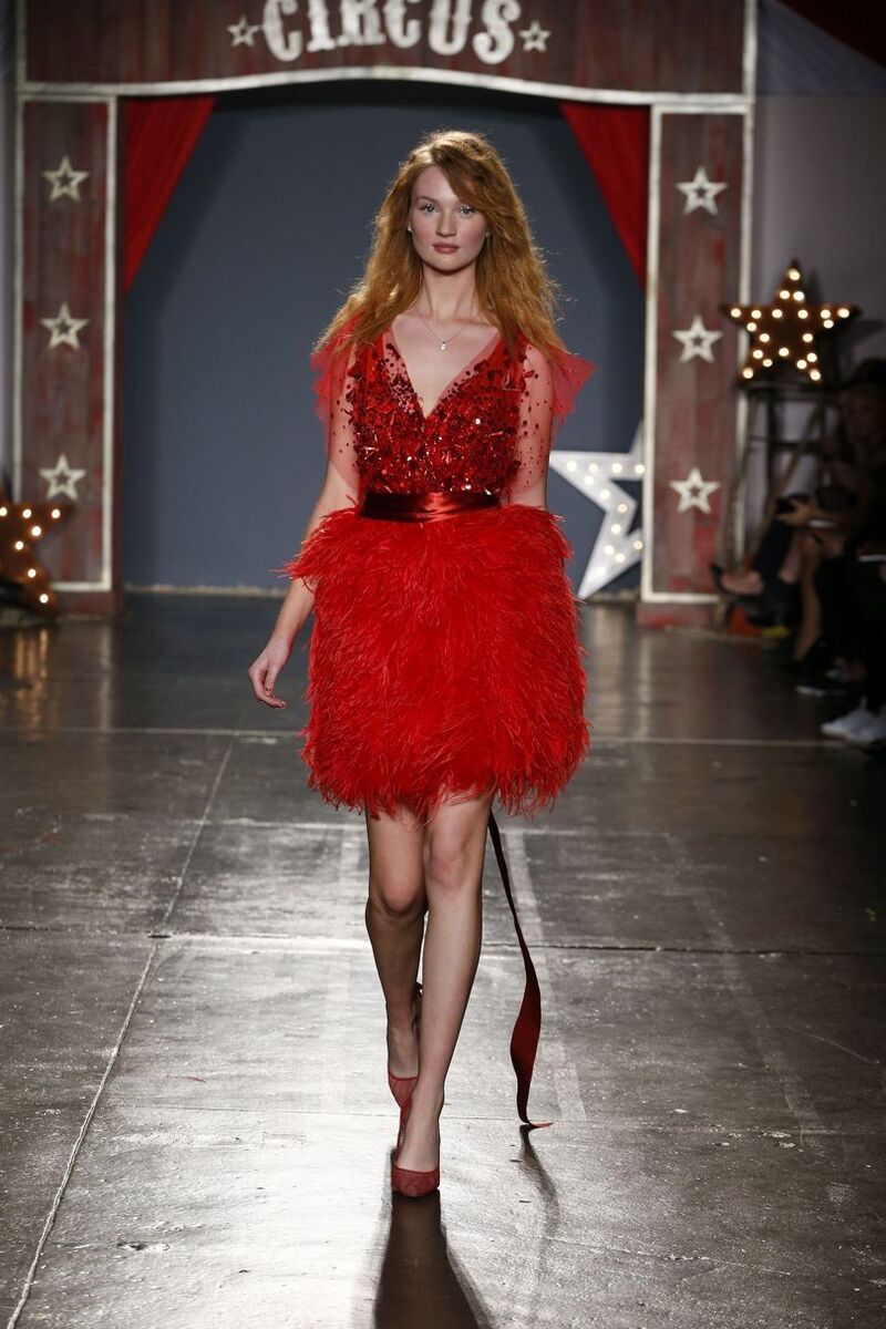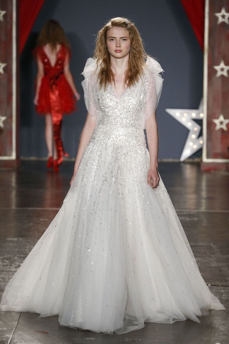 Trends have been changing recently, and you don’t necessarily have to wear a classic dress. This is why Jenny presented an unbelievable, beautiful and bold red dress in her S/S 18 collection, which is the perfect choice for a modern bride. It too is dominated by delicate lace and glitter, with the addition of fine feathers to create a luxurious skirt.