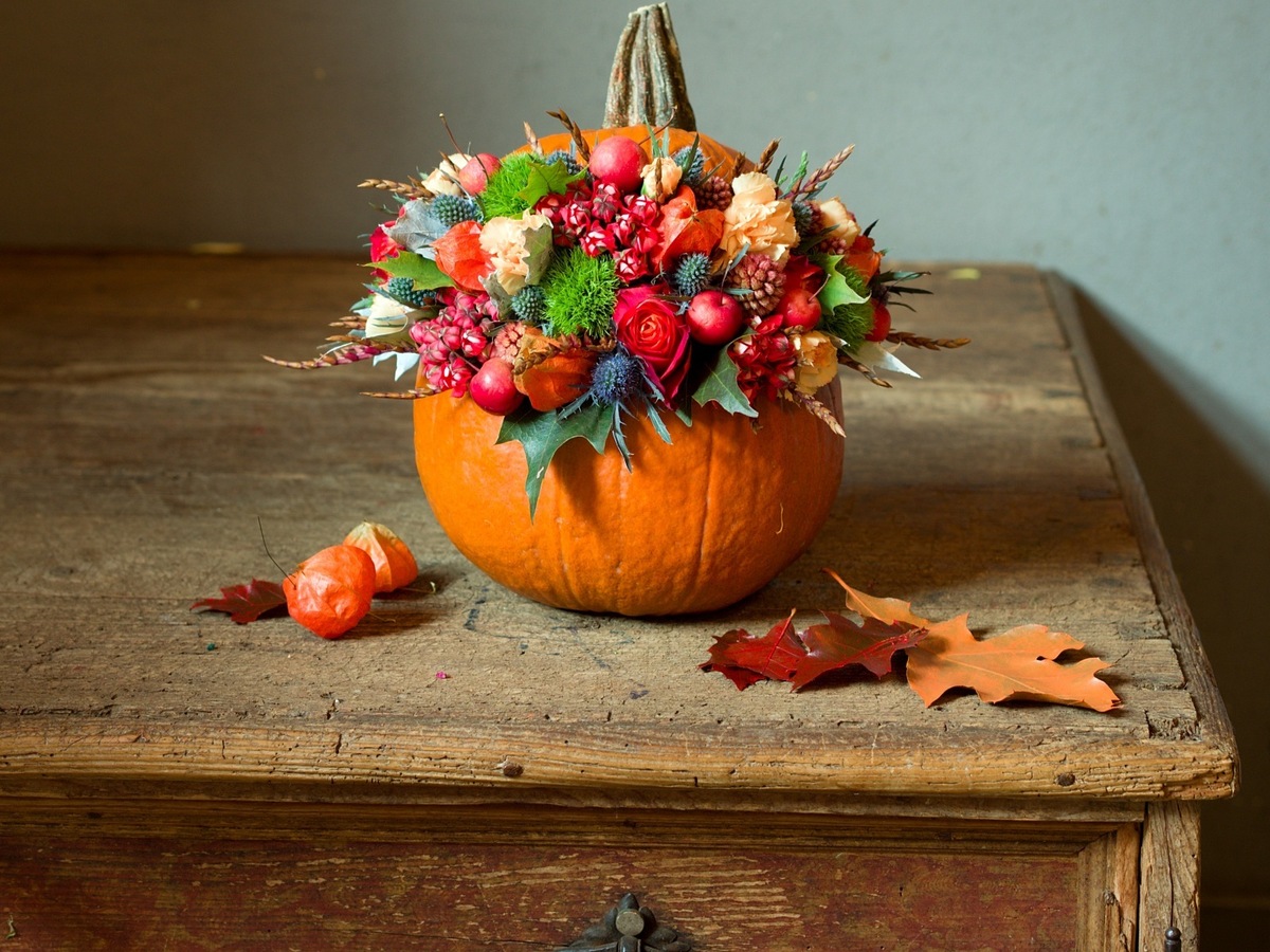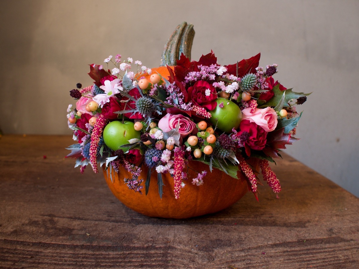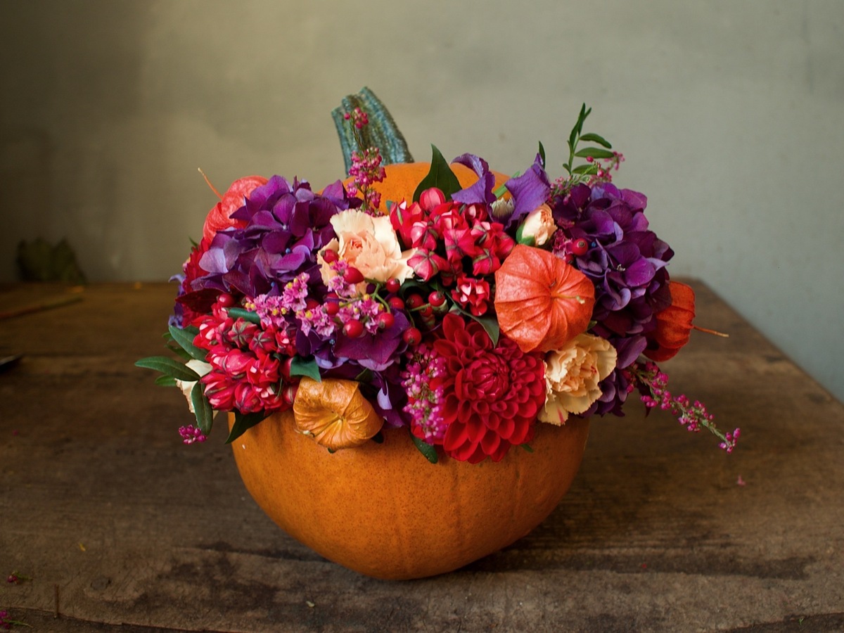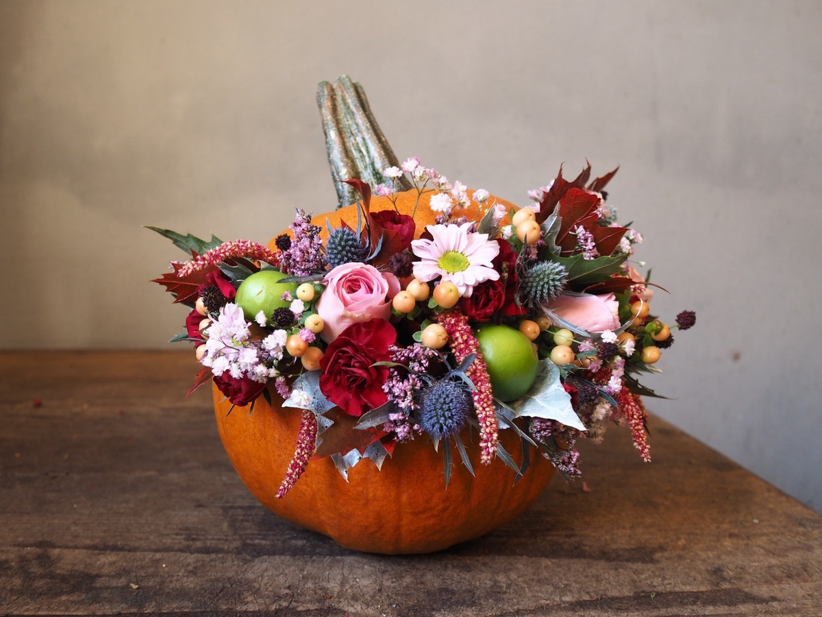 A pumpkin doesn’t always need to end up as a scary Halloween mask – they can also serve as elegant autumn vases. Luxurious flowers with colors ranging from light pink to dark purple form their beautiful filling.