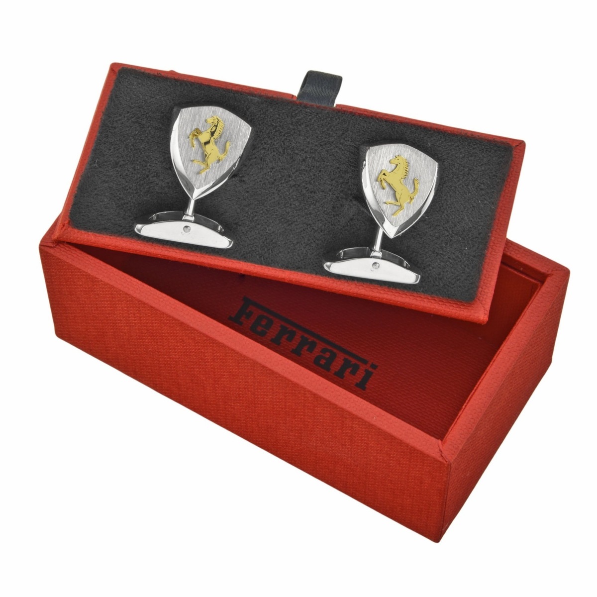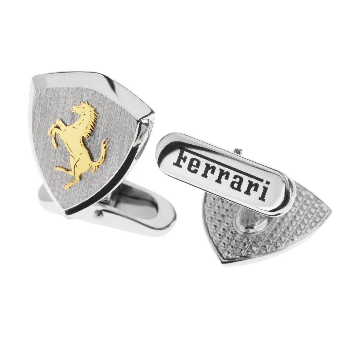 These stylish oval Ferrari cufflinks are handmade in Italy with the aid of traditional goldsmith’s methods from rhodium-plated 925 silver. They are shaped like the Ferrari shield and have a Cavallino Rampante in the centre from hand-polished 18 carat gold. A certificate of authenticity is included with these luxury cufflinks which come in a red box decorated with the above-mentioned logo.