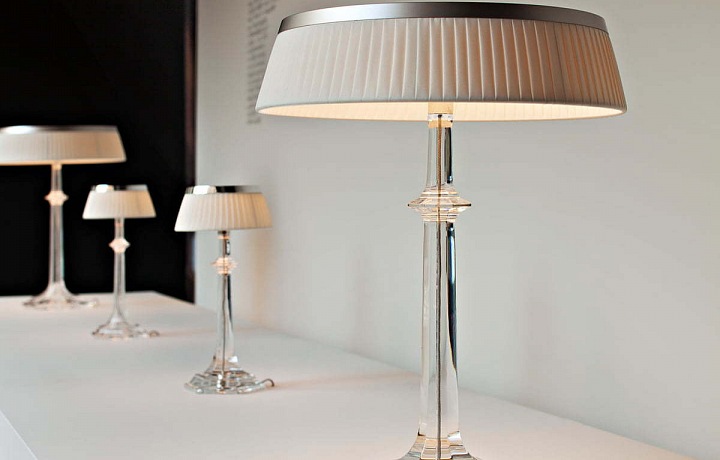 At first glance your attention is captured by the luxurious, transparent crystal stand, whose lines are reminiscent of the iconic Baccarat pieces. The Bon Jour Versailles lamp is crowned by a glossy chrome plate. Thanks to the innovative LED technology Edge Lighting developed by Flos and the elegant shade of pleated fabrics gives off warm, organic light. The lamp itself, enveloped in luxurious light, looks as if it is talking to you.