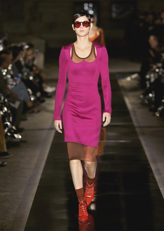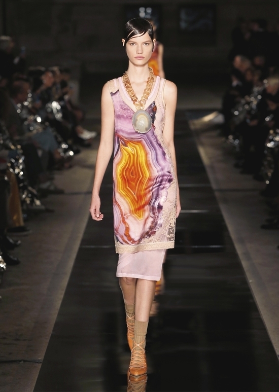 The collection is dominated by earthy colours such as beige, nude and orange and the pivotal colour is classic black. The most eccentric designs in the collection are dresses printed in a psychedelic manner which take on striped patterns or distorted circles reminiscent of a cross-section of stone.