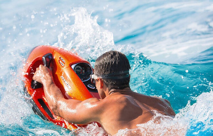 Are you a fan of the James Bond action scenes? You are very lucky, because it is just this kind of adrenaline that you are most likely to experience. Water sports at Cayago AG come with Seabob. This sea toy can be likened to an underwater scooter which allows you to glide on and above the water and also can provide a sensual journey into the undersea world. Using modern, lightweight construction, the Seabob weighs between 29 and 35 kg, depending of course on the model. The Seabob F5 weighs 29 kilograms, but it has the power of 480 Newtons.