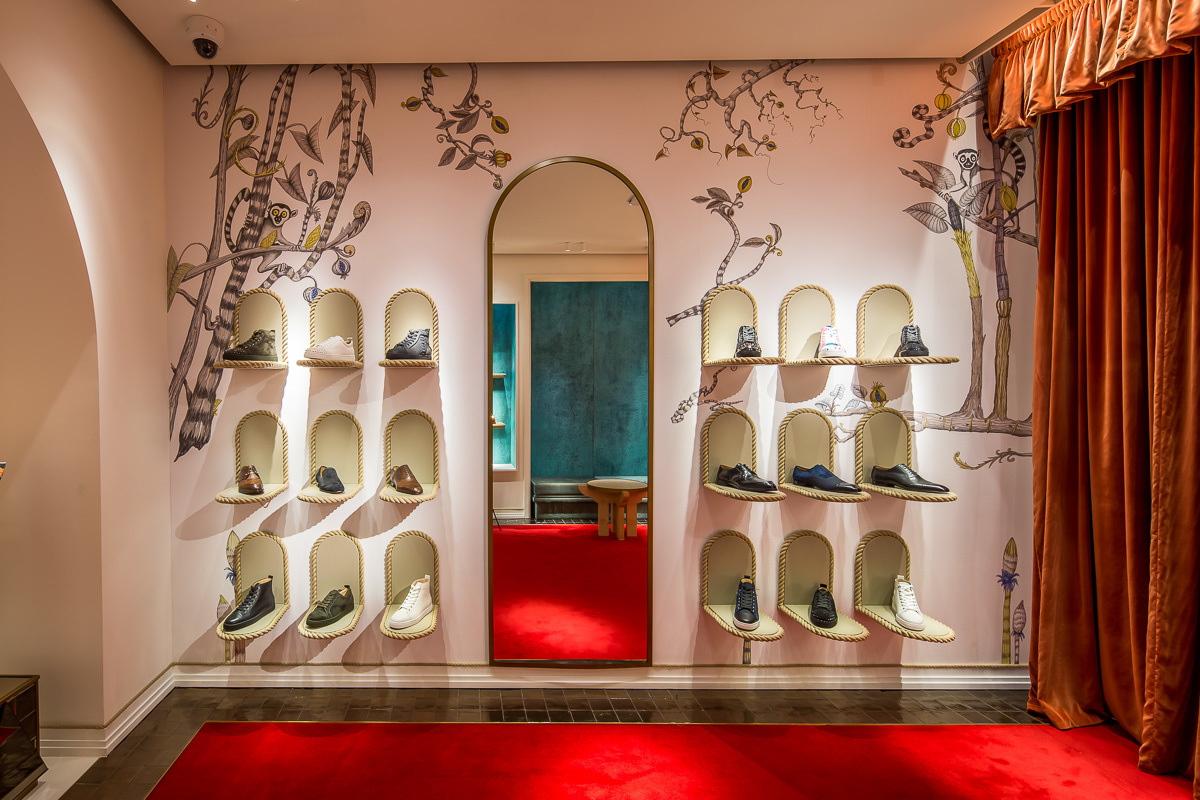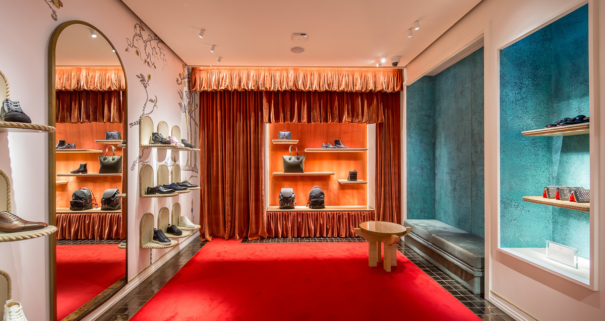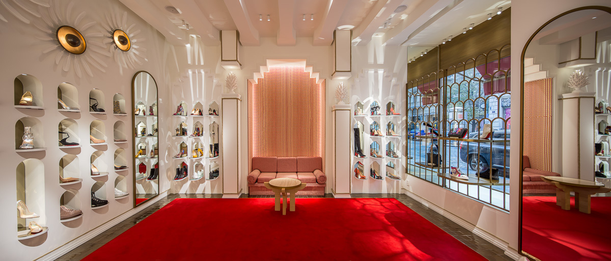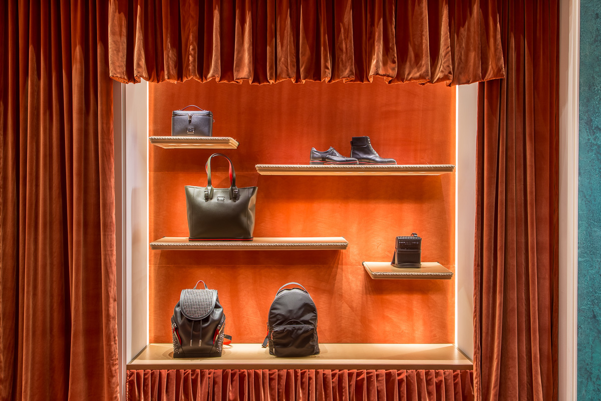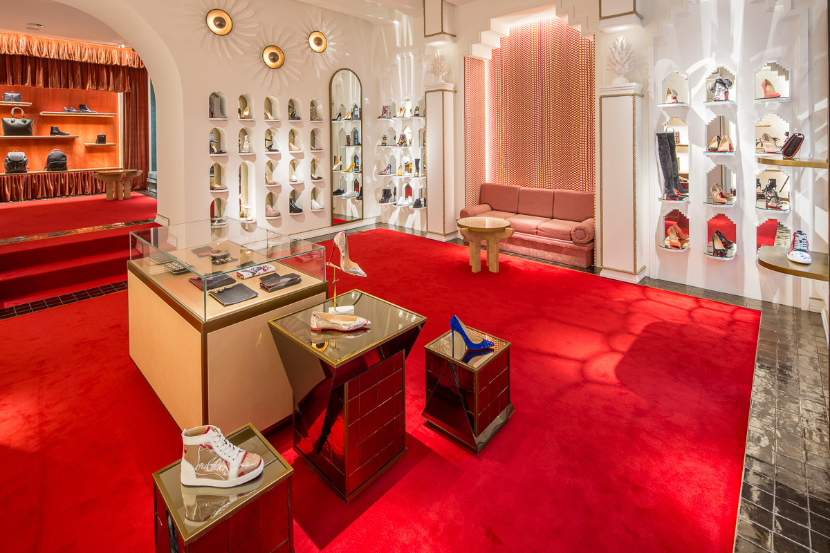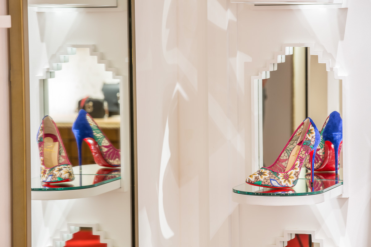 You can find all the iconic signs of a fashion house in the boutique – such as arches, niches, the floor covered with red carpet, or a mixture of fabrics and new materials typical for all collections of this original brand. All around you, you can see gorgeous luxurious shoes and handbags smiling at you from the shelves and showcases.