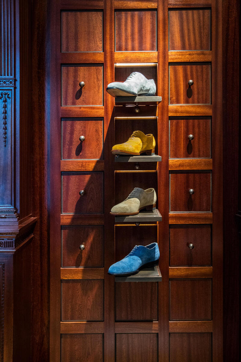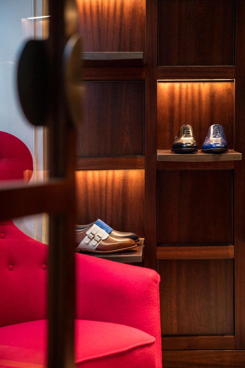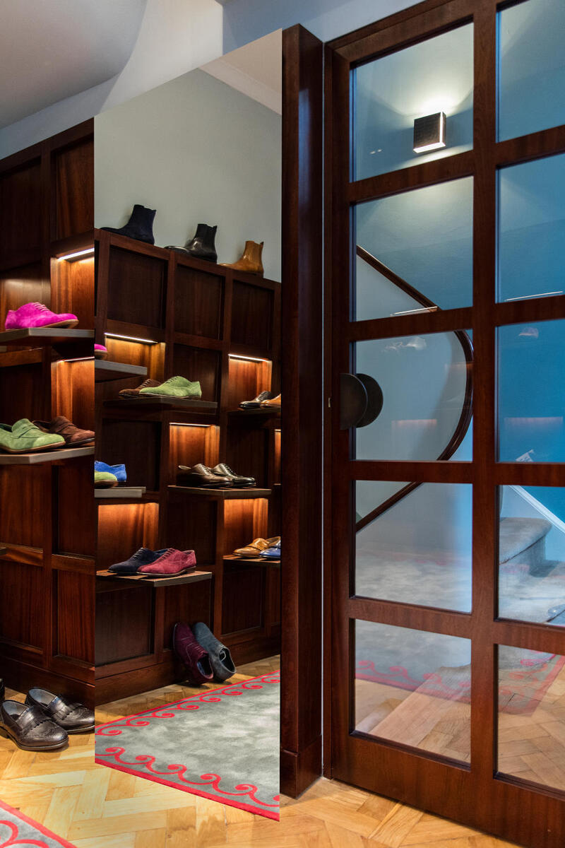 The men’s three-storey boutique is located next to the women’s branch in the shopping centre Burlington Arcade, which lies in the heart of the Mayfair district. The boutique is distinguished by its unique selection of designer shoes, but also by its interior. The mahogany wood and neutral natural tones bestow the feeling of character, luxury and homeliness.