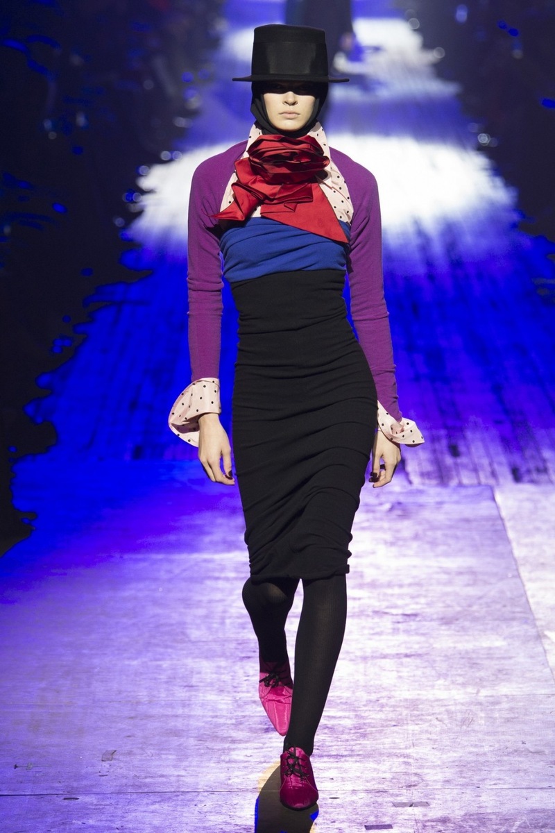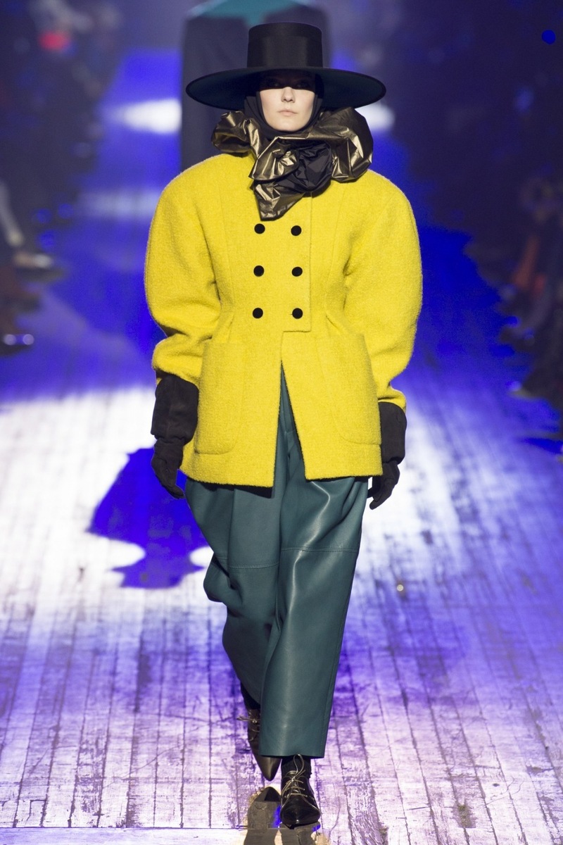 In addition to broad shoulders the hallmark of that time were narrow waists, loose trousers, ruched detail at the neck and, of course, luxurious hats. And that is exactly what the Marc Jacobs fashion house used in its collection, not wishing to modernise the fashion style in any way, but just to let it stand out. Wide shoulders in the collection accentuate slender waist, a notably feminine attribute of every woman. This beautiful feature is emphasized by luxurious leather or cloth loosely-fitting, belted trousers.
