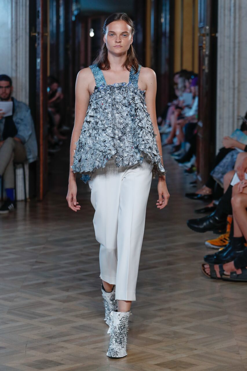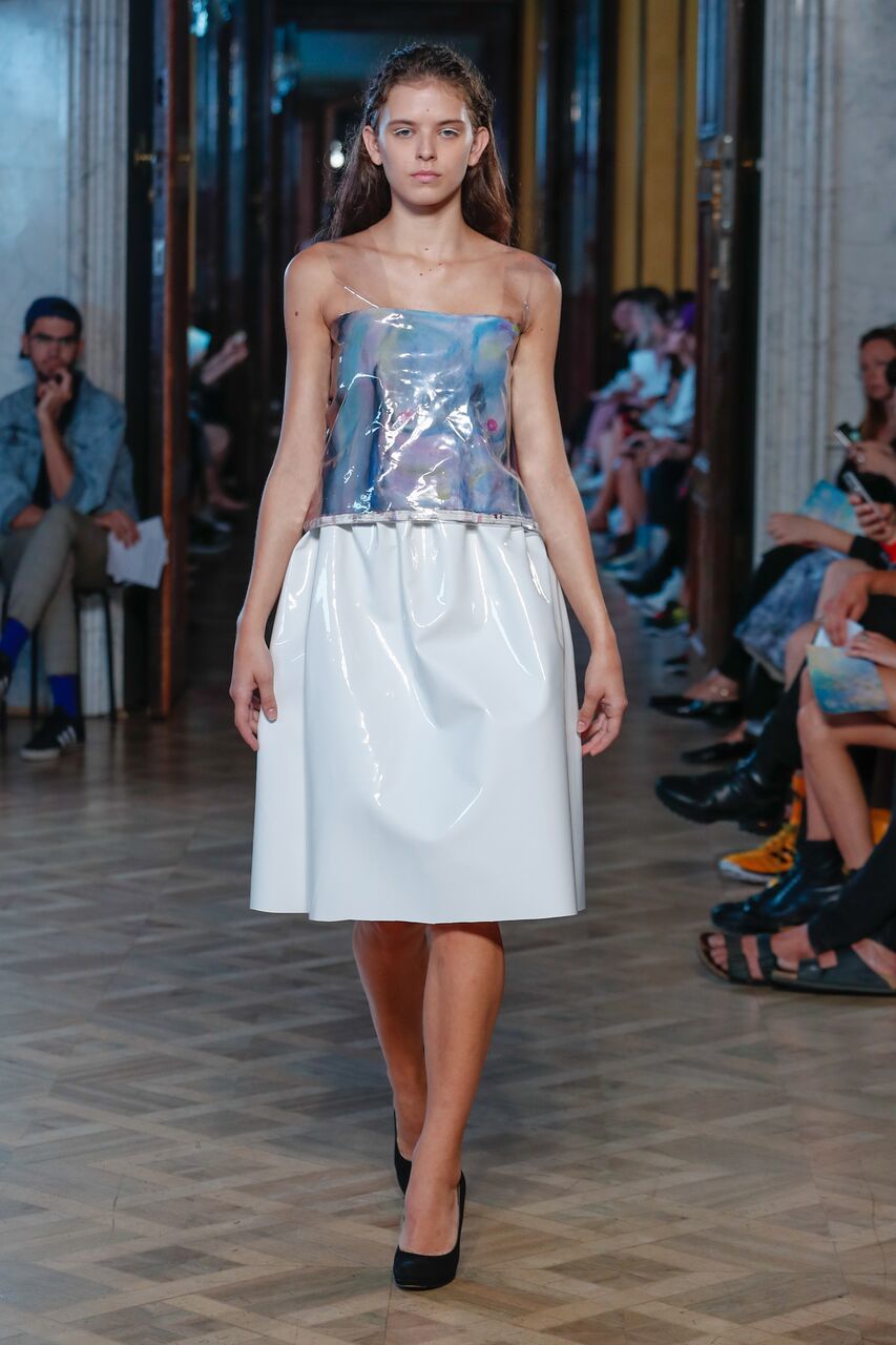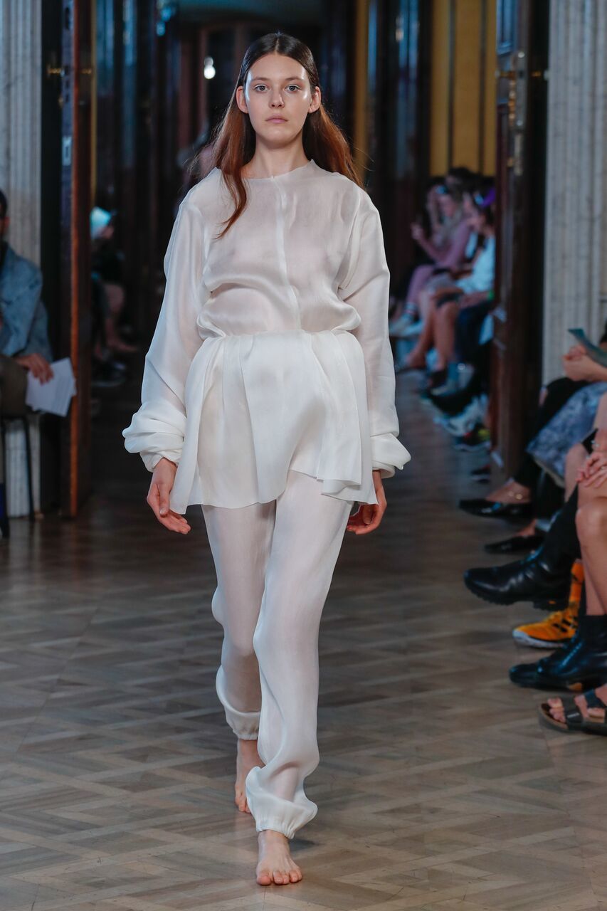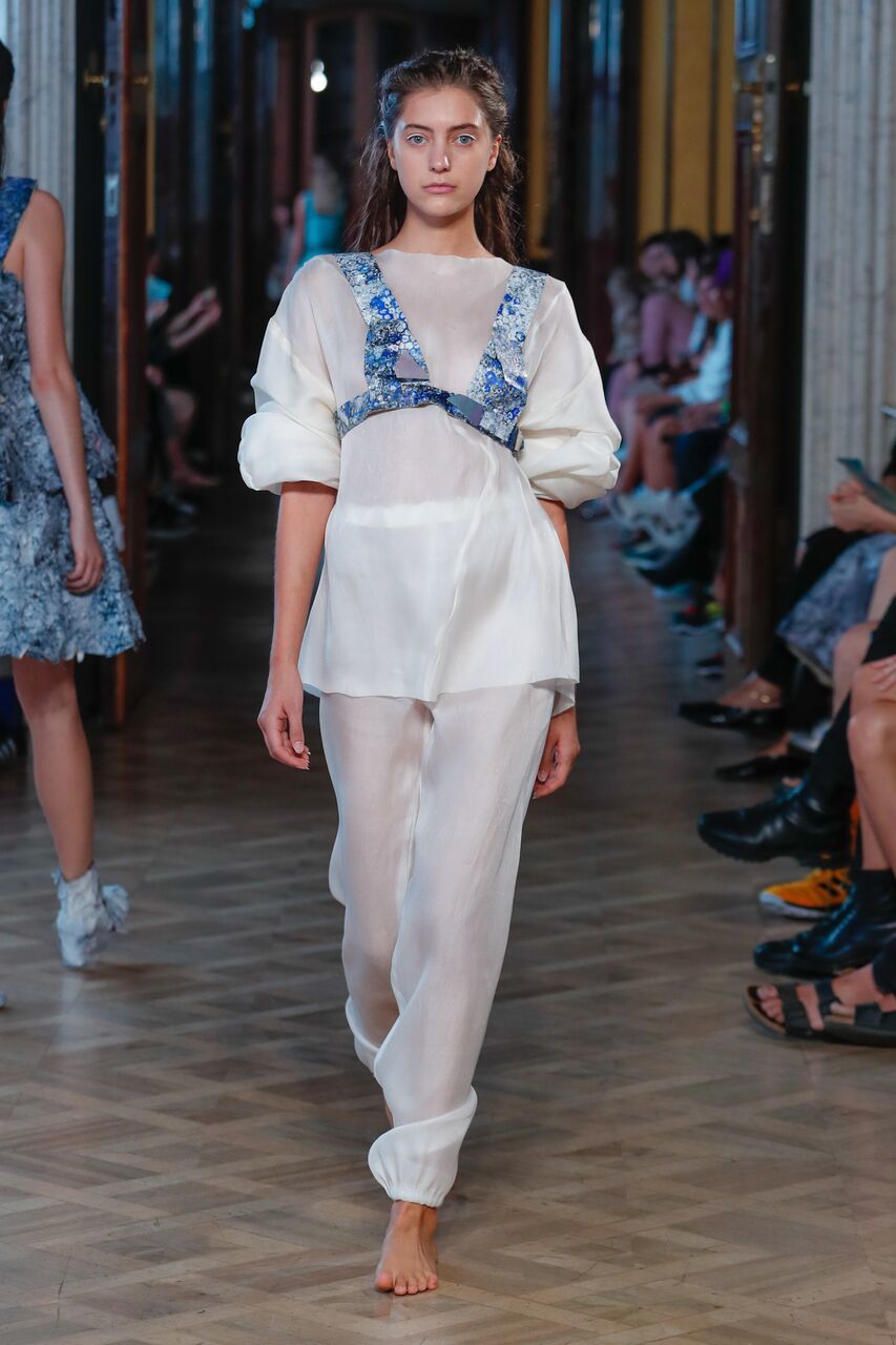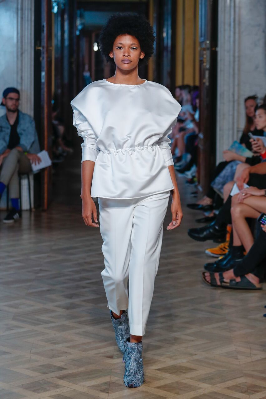 Of course, there was also a model that for my own purposes I named "yet another crazy MBPFW model". It is a white suit most likely made of organza. I wouldn´t that much mind the gently translucent trousers. However, that blouse is sheer hell. The worst is the gathering of material around the waist. Who would voluntarily wish to look like a lunatic asylum inmate in 5th month of pregnancy?! I am afraid that no one.
