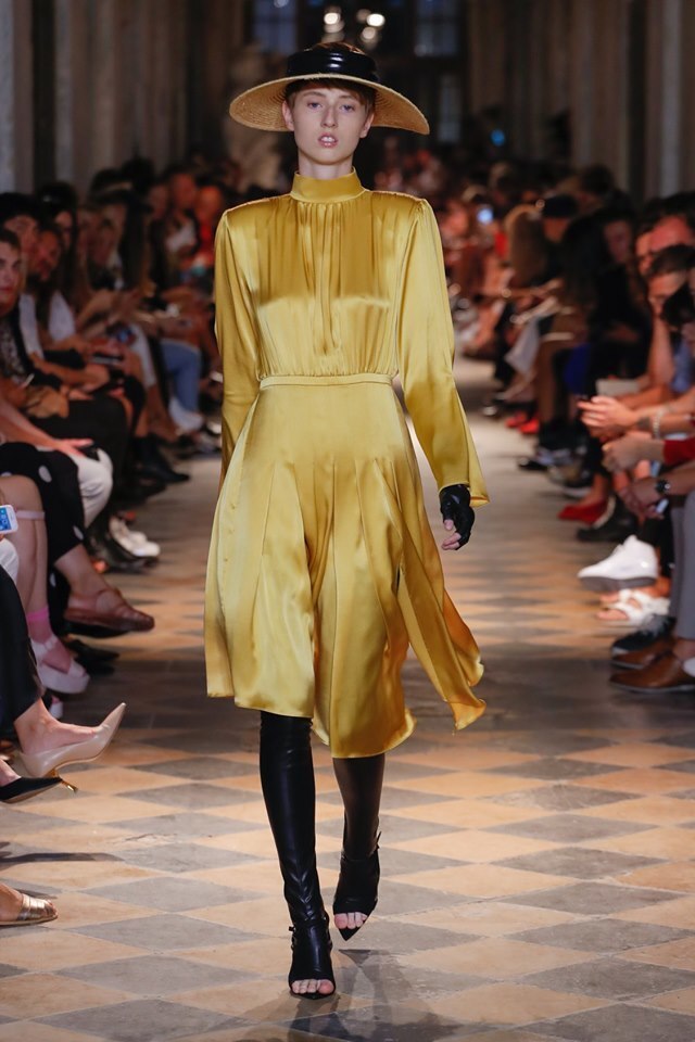 The one thing that stood out from the concept of the entire fashion show was a bright yellow dress complemented by leather gloves and tall black boots with high heels. Even still... A stark contrast between the outfit and accessories can often be a very interesting combination. However, if you decide to put on a dress evoking the image of princess Belle from the famous Disney story Beauty and the Beast, leave the rest at home and replace it with simple light-colored pumps and a clutch purse.