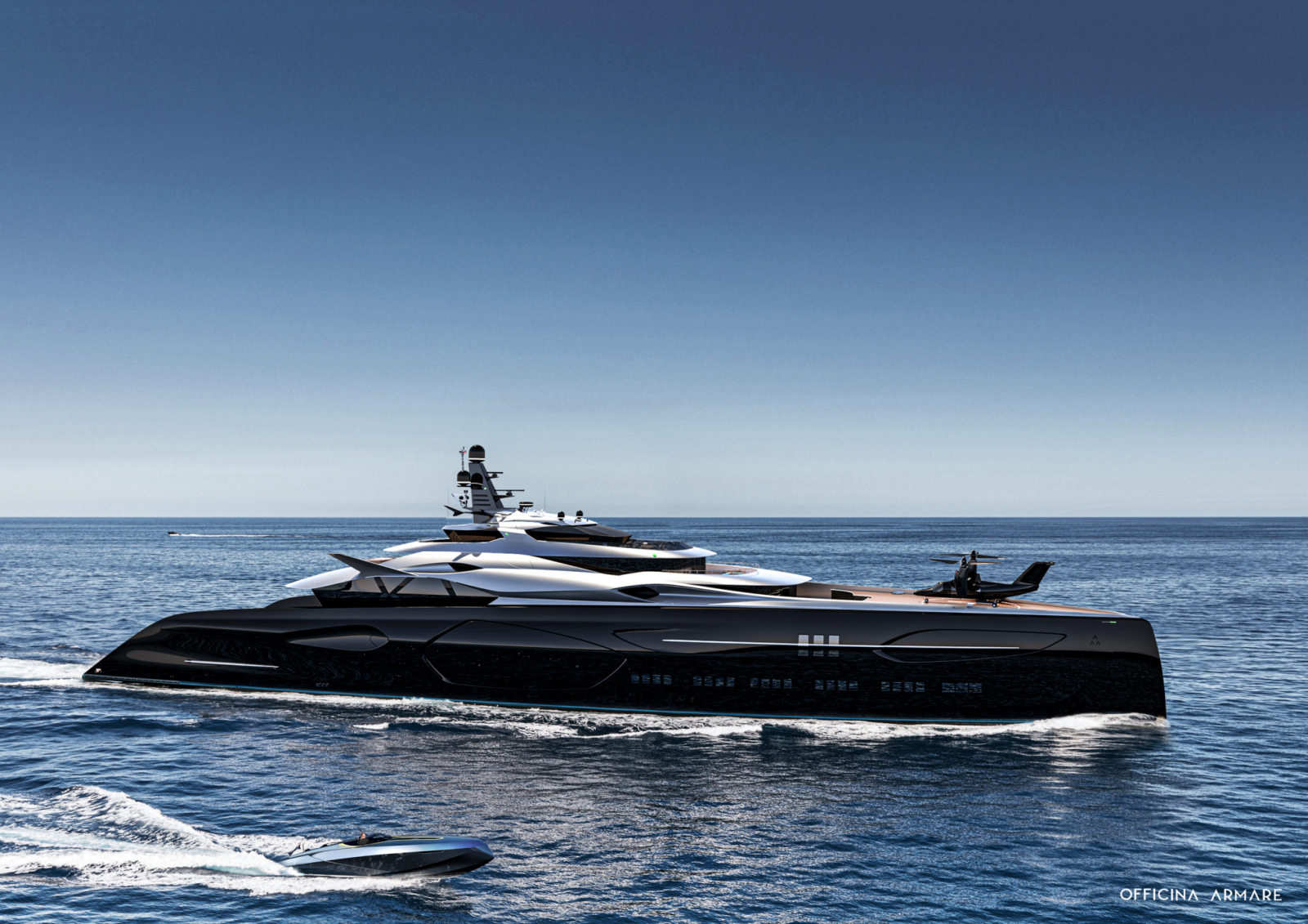 Clearly its design. It is appropriate to applaud the designers from Officina Armare and tip your hat to them. They managed to design a real masterpiece. If your guess was that they'd drawn inspiration from naval battleships as well as modern spacecrafts, you were right. The luxurious yacht with a black glossy finish is so impressive that it makes one's blood pressure rise, and you'd definitely love to see it parked next to your house. Or at least take it out for a sail.