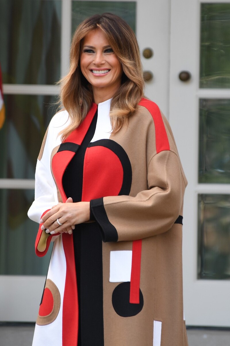 In late May, while visiting Arlington National Cemetery, Melania donned a white Gucci coat, adorned with gold buttons and gold details on her pockets. Just like in the previous case, she complemented the luxurious look with white Manolo Blahnik pumps. Beauty lies in simplicity!
