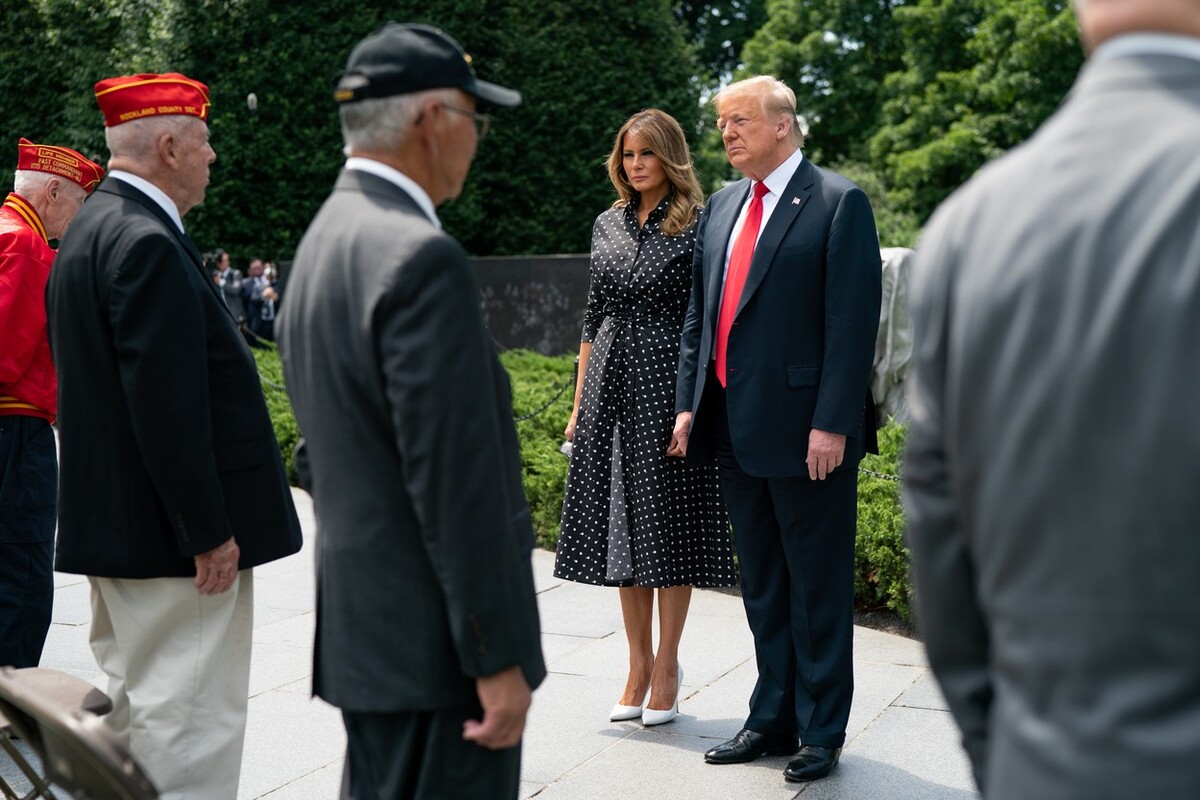 It seems that Melania is either completely crazy about white Manolo pumps, or she isn't one of those women who spend obscure amounts of money on shoes every month. She wore these stylish Manolo Blahnik pumps for the third time, only a month after she'd been last spotted in them. This time, she combined them with a black shirt dress with white polka dots by Rosetta Getty. And where did Melania go in this outfit? To visit the Korean War Veterans Memorial.