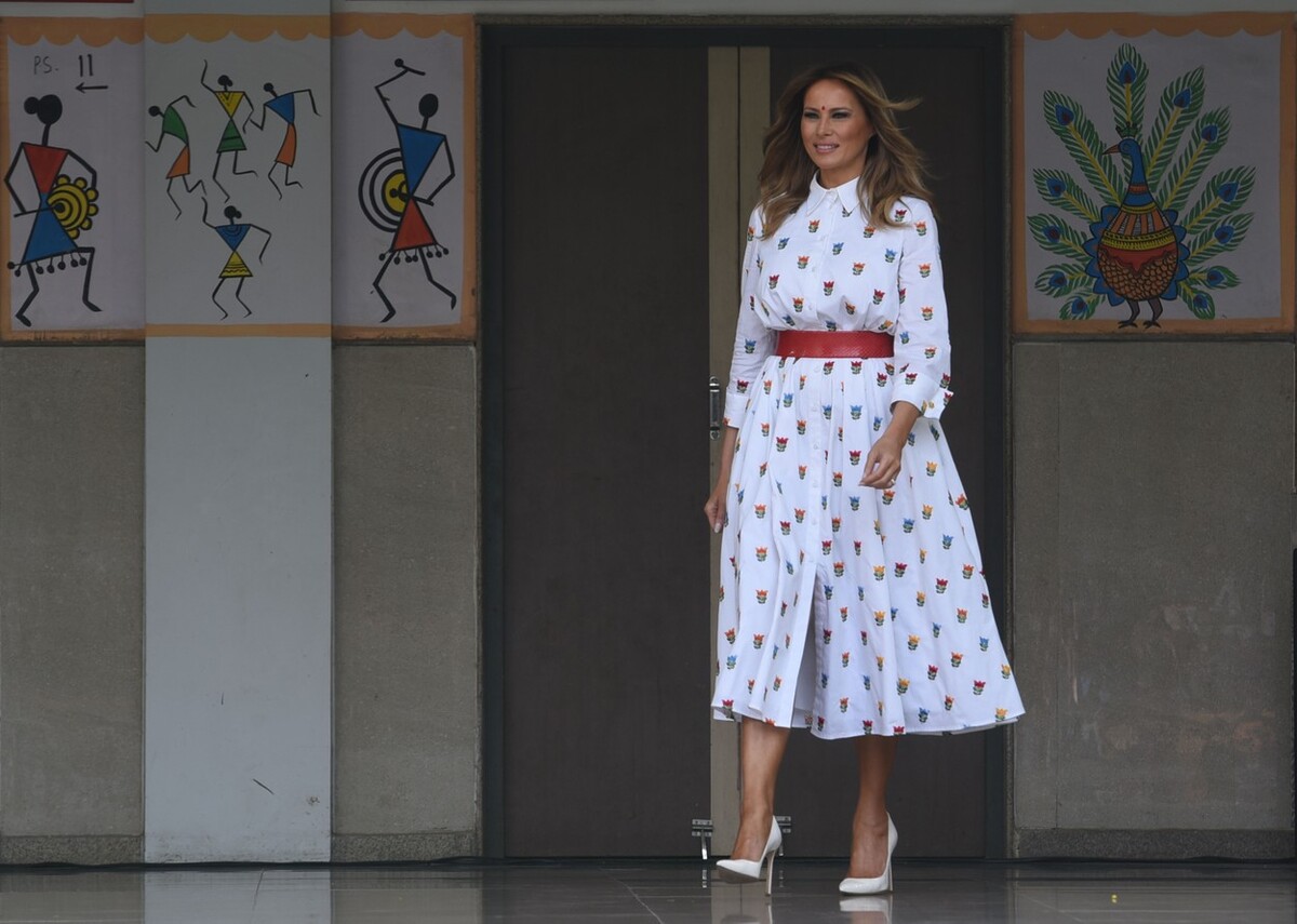 At the beginning of the year, on February 25, Melania Trump and her husband Donald went to India for a two-day visit. On one occasion, she wore an original dress with a floral print by designer Carolina Herrera, which she combined with white leather pumps by Manolo Blahnik. To emphasize he slim waist, Melania chose a minimalist red Max Mara belt with a snake motif to complement her dress.