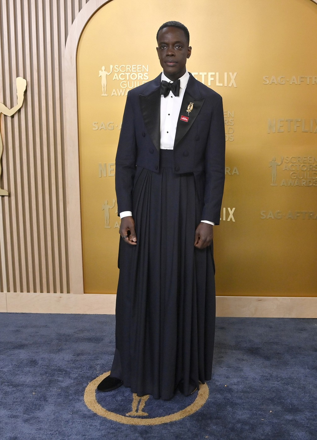 Kadiff Kirwan from the series Slow Horses shone on the red carpet in a short oversized jacket. Underneath, he chose a see-through top and trousers that were tighter than the jacket. Loafers with a massive sole and a brooch on the lapel give the outfit the right touch.
