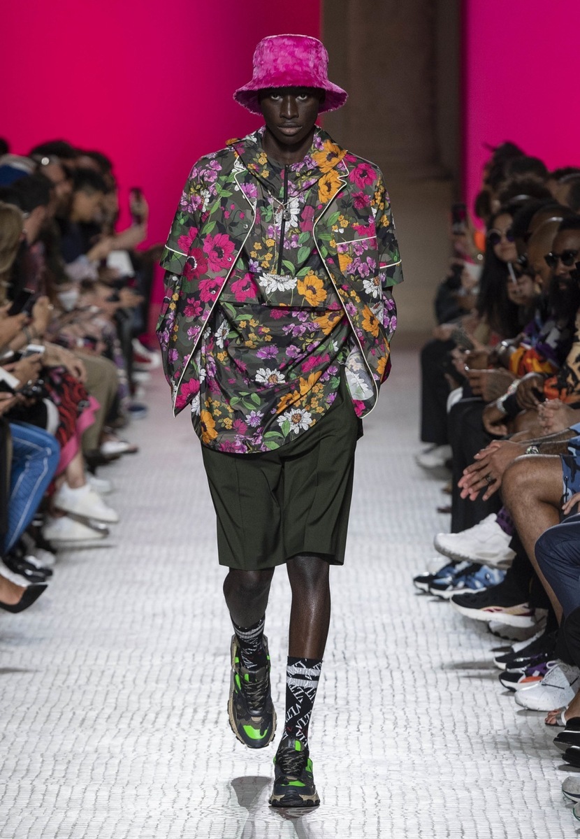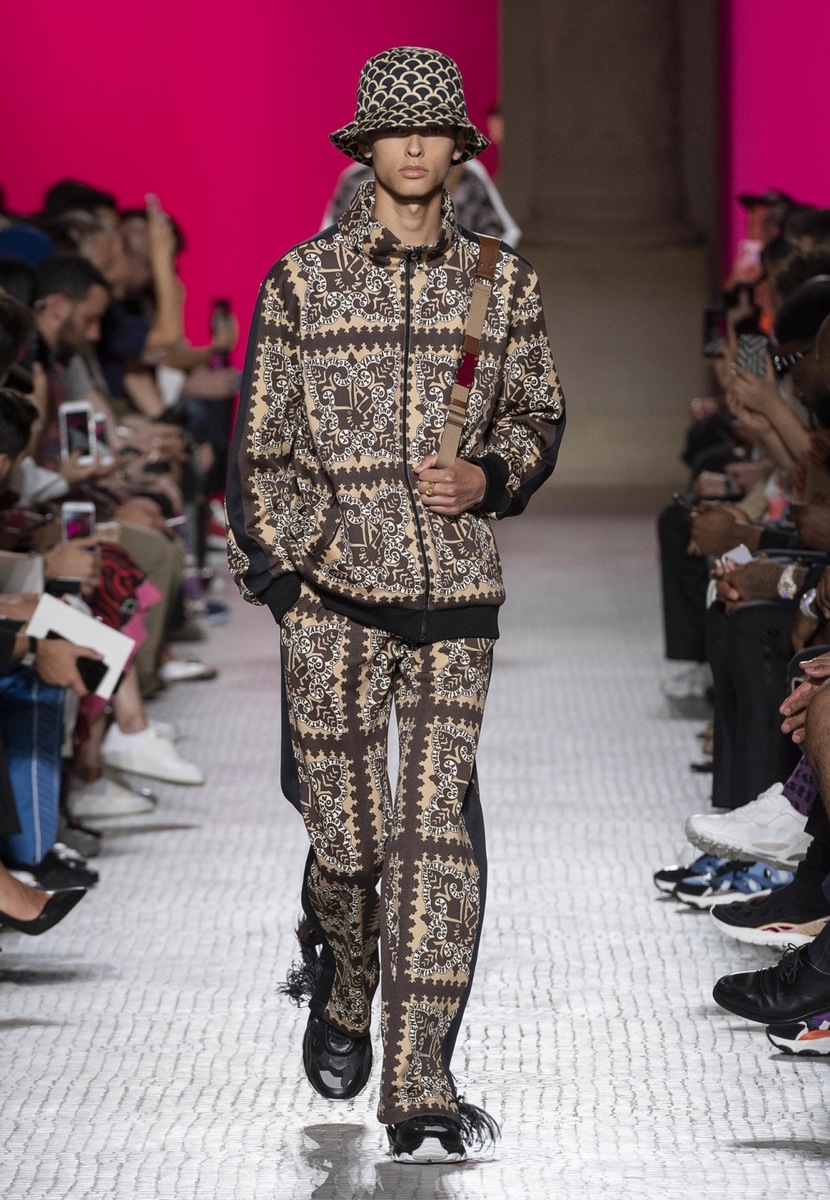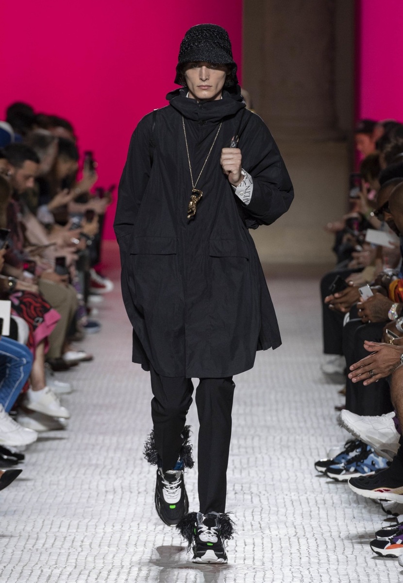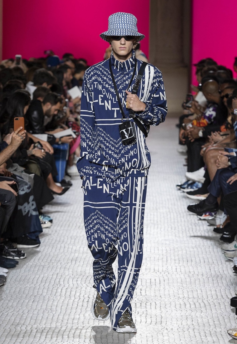 If I cross out those ostrich feathers in plimsolls, which I would rather not like to see on heterosexual men, it is mostly a kind of "chill". Black and white sweatpants, a white shirt, the Valentino logo, in combination with a laid-back baseball cap and white sneakers. In my opinion it is precisely this model that sums up the entire collection. It is simply sporty elegance of a new era. And how about to go in something like that for example to work? I think it is entirely all right.