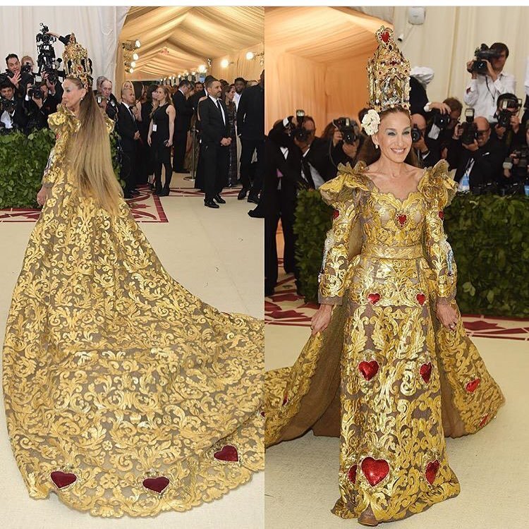 The actress, who is better known by the name of her character Carrie from “Sex And The City”, wore an enormous gold gown scattered with hearts and an unparalleled headpiece to the Met Gala. Dolce & Gabbana whose base is in Italy and which is a very Catholic brand, including the designers themselves, really cut loose on the headdress. It depicts the birth of the Son of God. I have not seen anything as shocking and simultaneously fascinating for a long time. But is this model one of the best? I don’t think so....Sarah reminds me of the character of the Queen of Hearts from “Alice in Wonderland” played by Helena Bonham Carter. And her blue-toned makeup and the horsetail hairpiece? Ridiculous….