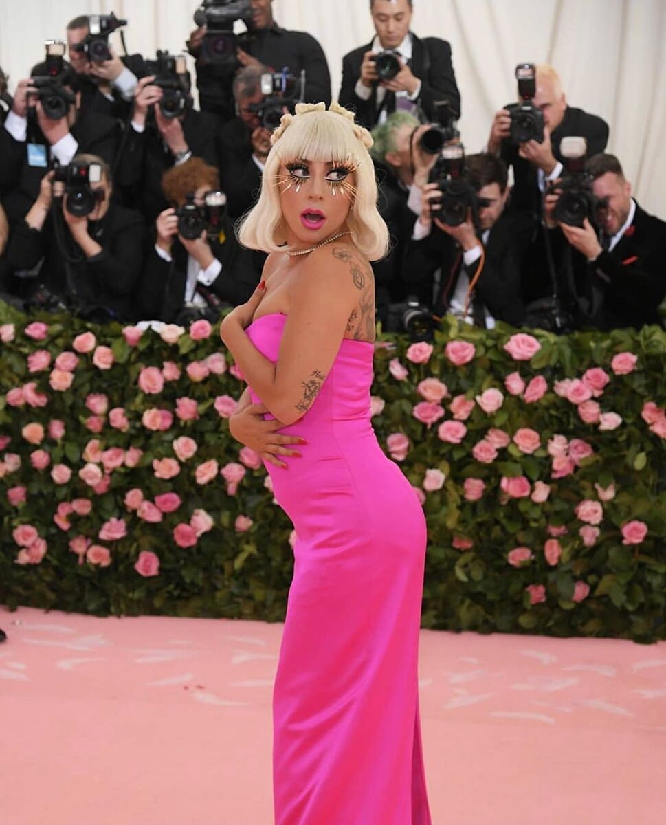 The quirky Lady Gaga entered the red carpet in Brandon Maxwell's fuchsia robe just to take it off, then took off two more layers of dresses and ended up in black lingerie with sequins, fishnet tights and platform shoes. This is what we call an extravagant entry to the Met Gala!