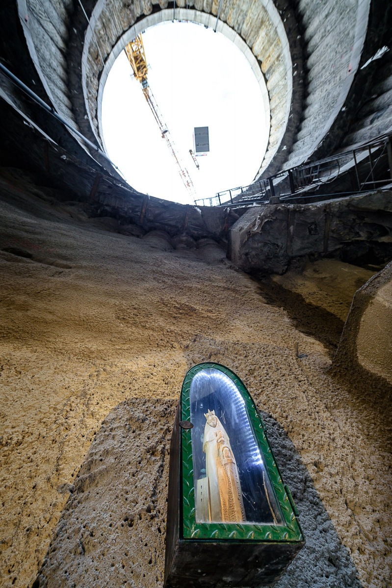 the men in yellow vests smile. The statuette was consecrated before Christmas. St. Barbara is supposed to look after the miners and builders who, together with their wooden guardian, will descend into a 120-feet pit.