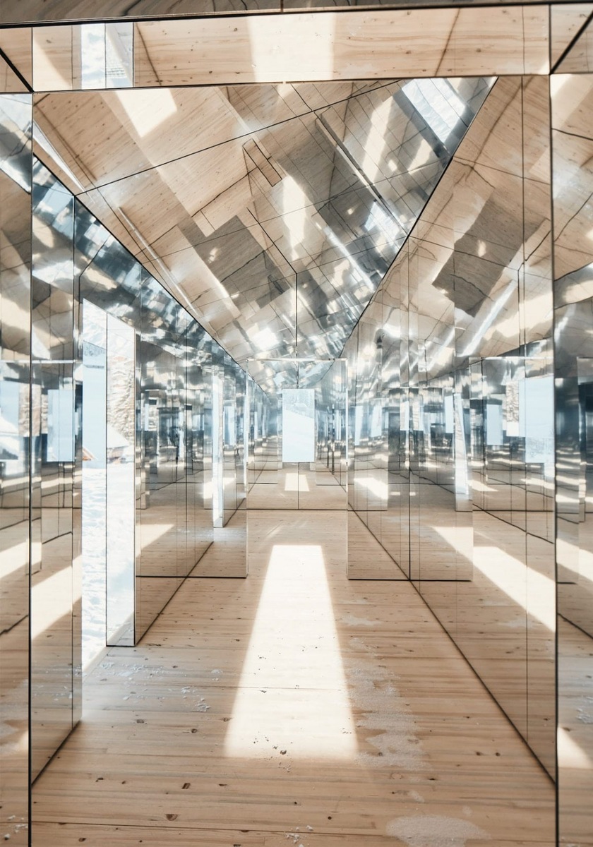 You might be surprised at the simplicity, which also dominates the interior of the building. Even here, you will find mirrors, both on the walls as well as on the ceiling. The interior is comprised of mirrors built at different angles, creating a kaleidoscope effect, flexing the light and creating unexpected reflections.