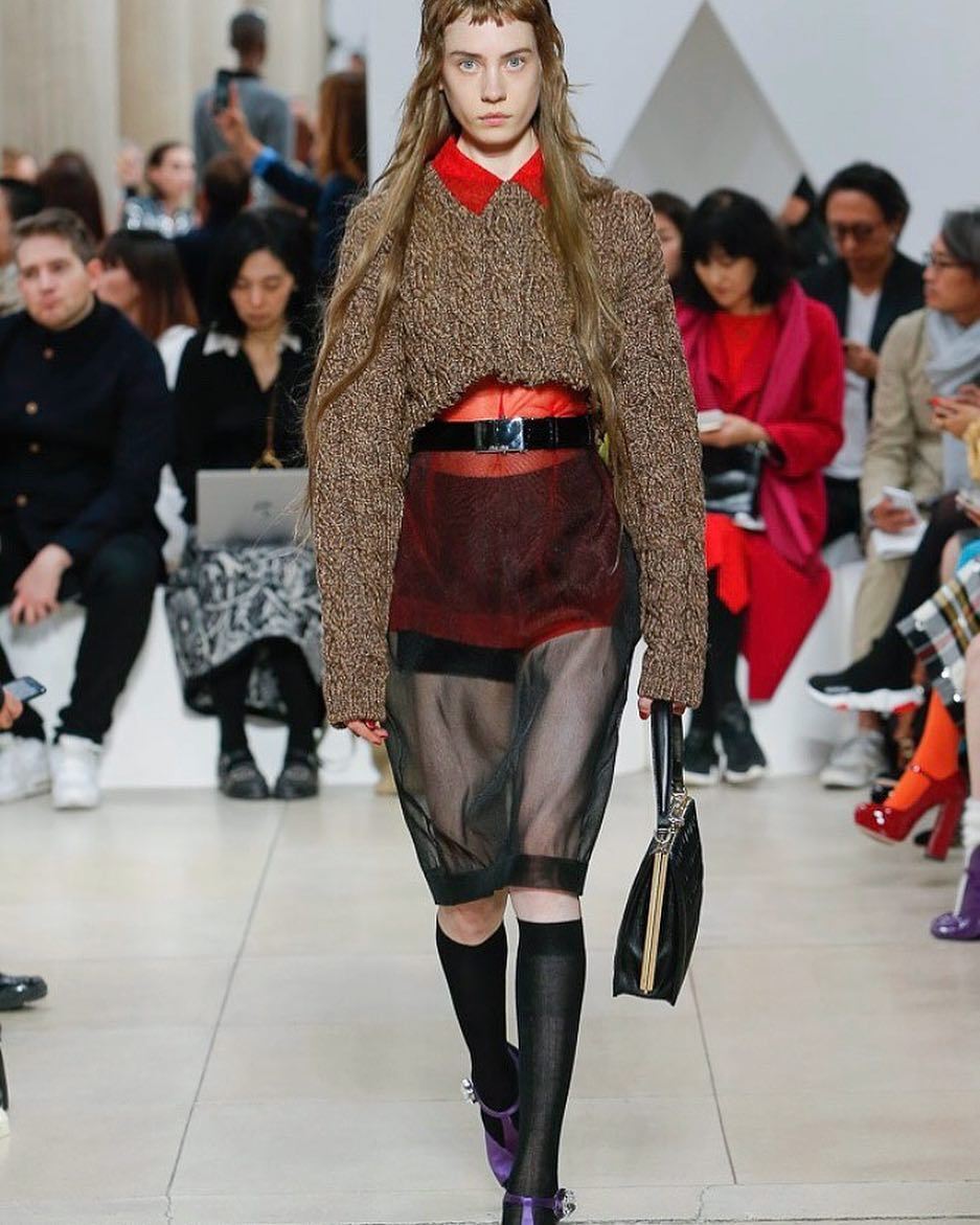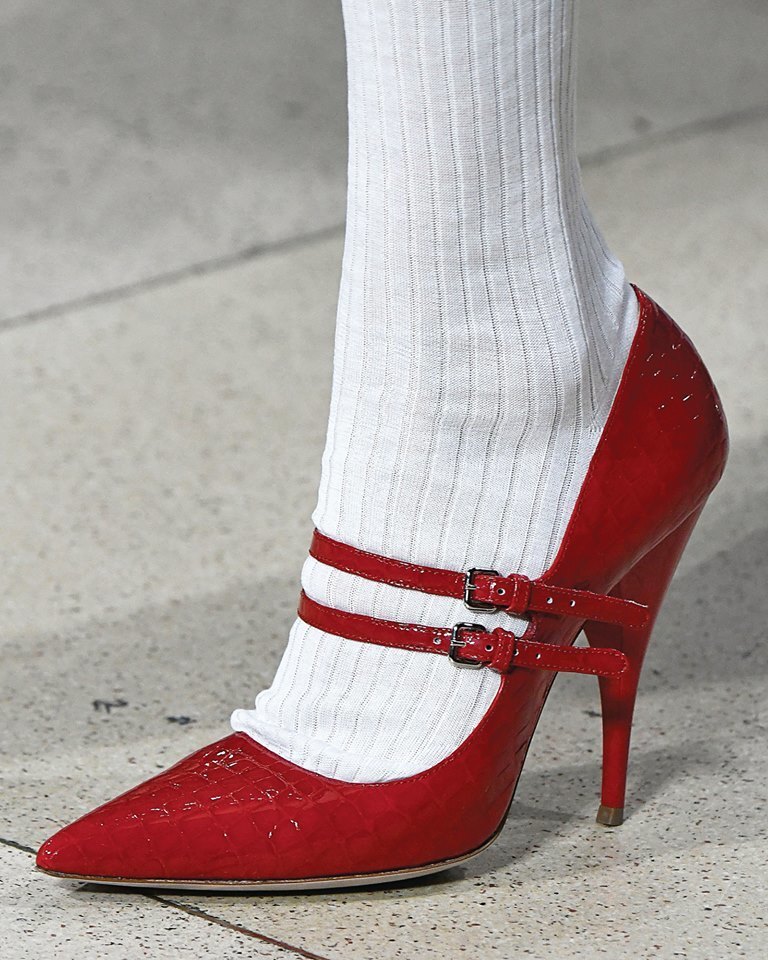 A trend which the general public is slowly but surely getting used to also appeared at the show of Miu Miu. The luxury brand sent a model on the catwalk in delicate shoes with straps combined with ribbed socks. Is it too much for you? Then opt for a more versatile variant – fine knee-socks that make the look more elegant.