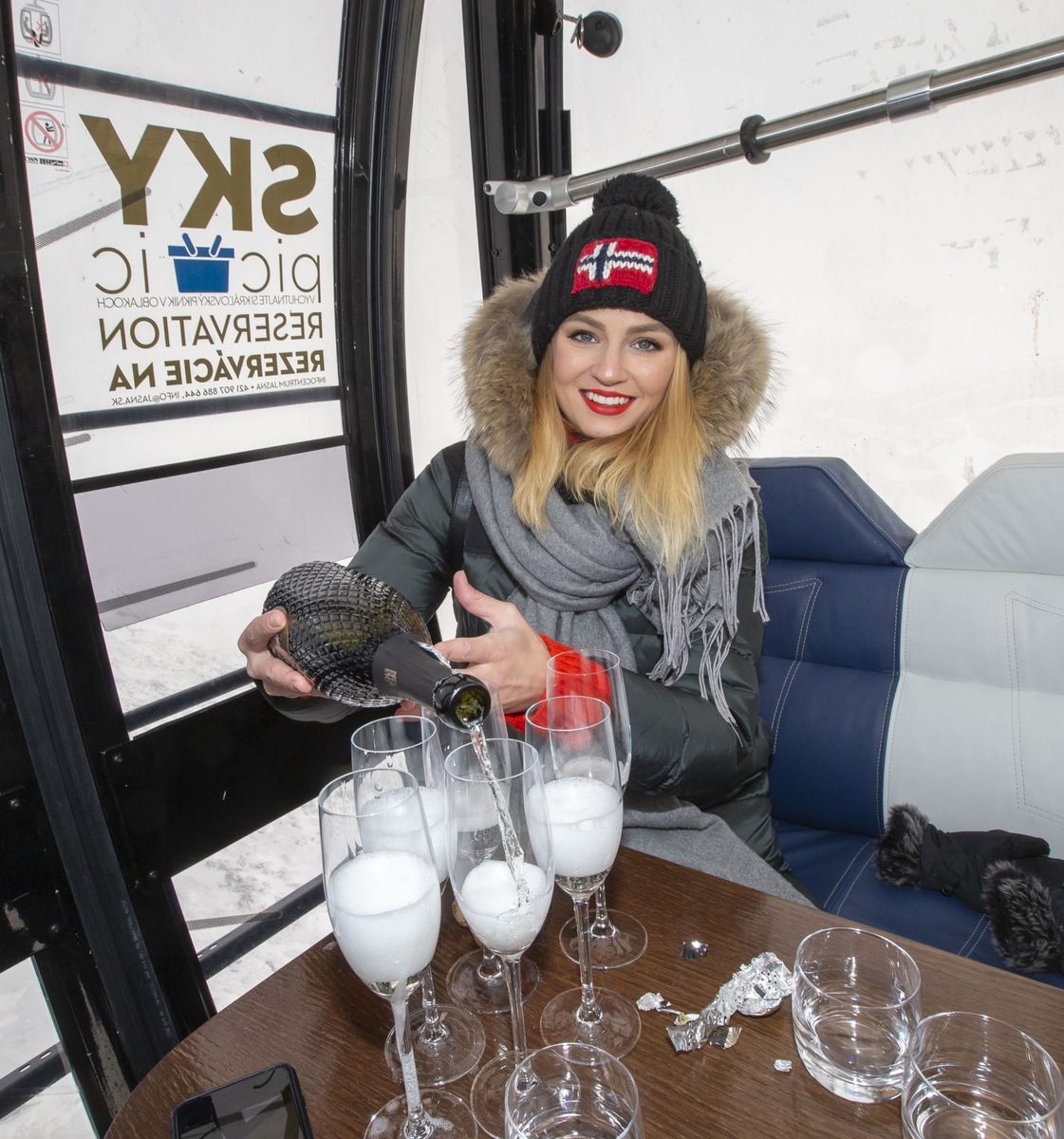 Jasná in the Tatras hosted a number of parties that kept going until the morning hours as part of the opening of the winter season. But the blonde didn't attend any of them. She rather treated herself to a "ski picnic", which consisted of sipping bubbles and eating delicacies in a cable car overlooking the breathtaking Low Tatras.