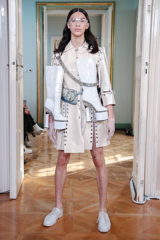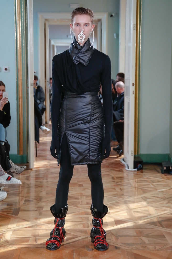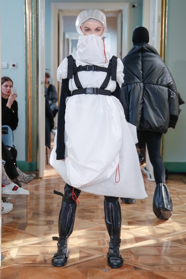 And what about the clothes by ODIVI? These consisted of some carpet tape joined into some sort of clothing! Anyone who thinks that wax is a cruel tool for depilation would die when taking off this model!