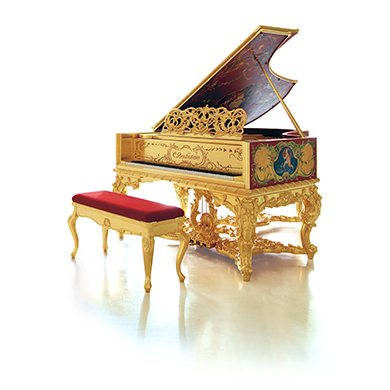 The personality of C. Bechstein presents a shining example of one of the most historically significant and modern piano makers in Germany. His piano is called The Golden Grand Piano. The “CB B 212” model is a masterpiece of acoustic workmanship and craftsmanship. It bears a rich golden decoration with fragile beautiful wooden carvings. This jewel is abundantly adorned with elegant miniature paintings in the Watteau style.