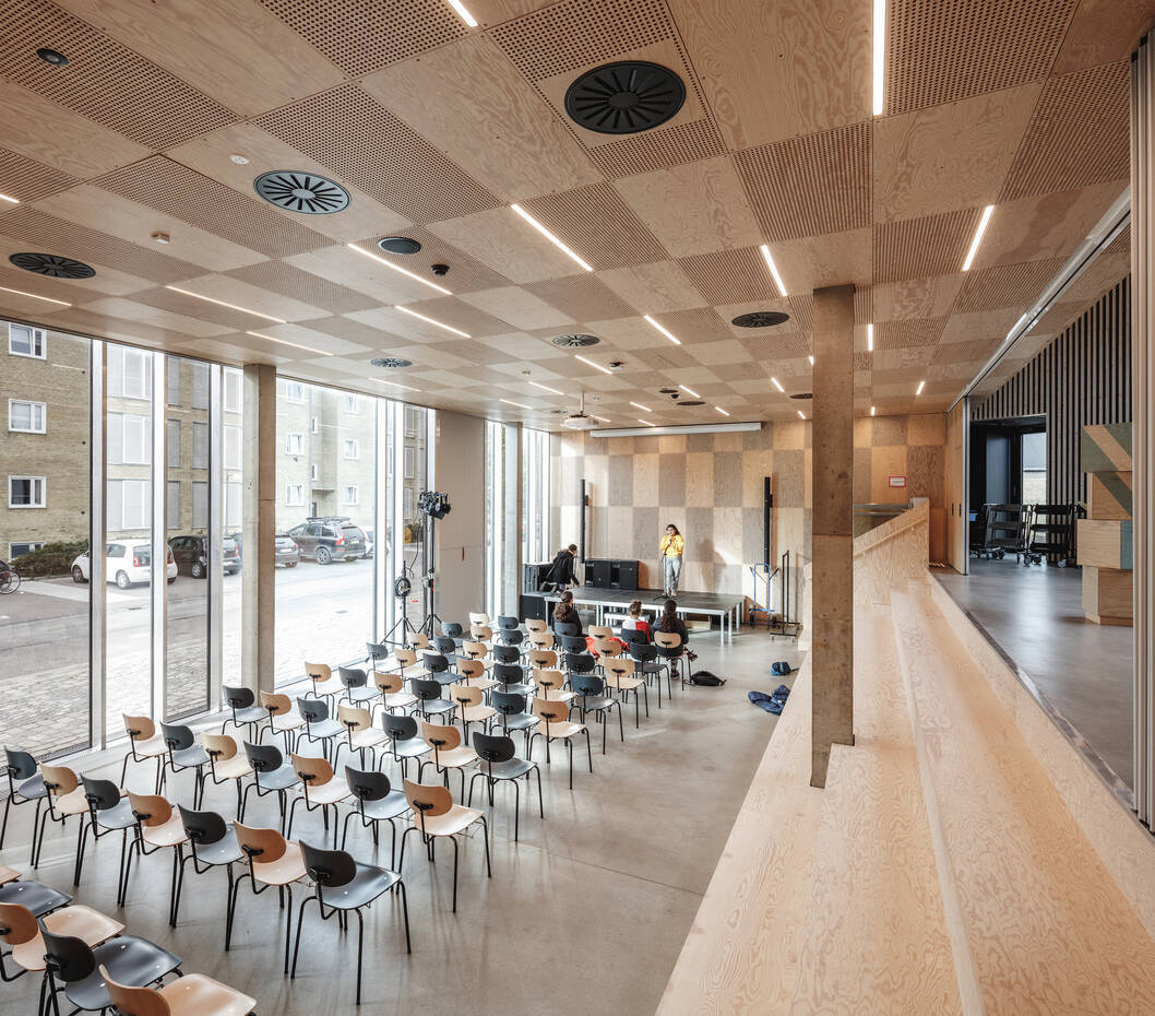 Thanks to its location in the center of Tingbjerg, the library constitues a common meeting place that acts as a magnet and attracts people to the area. They're invited to engage in countless activities and events in multifunctional rooms, including a variety of courses, workshops, lectures and music performances. Moreover, one can observe the hustle and bustle on the streets during all activities inside the building through the glass facades, so the visitors won't miss anything.
