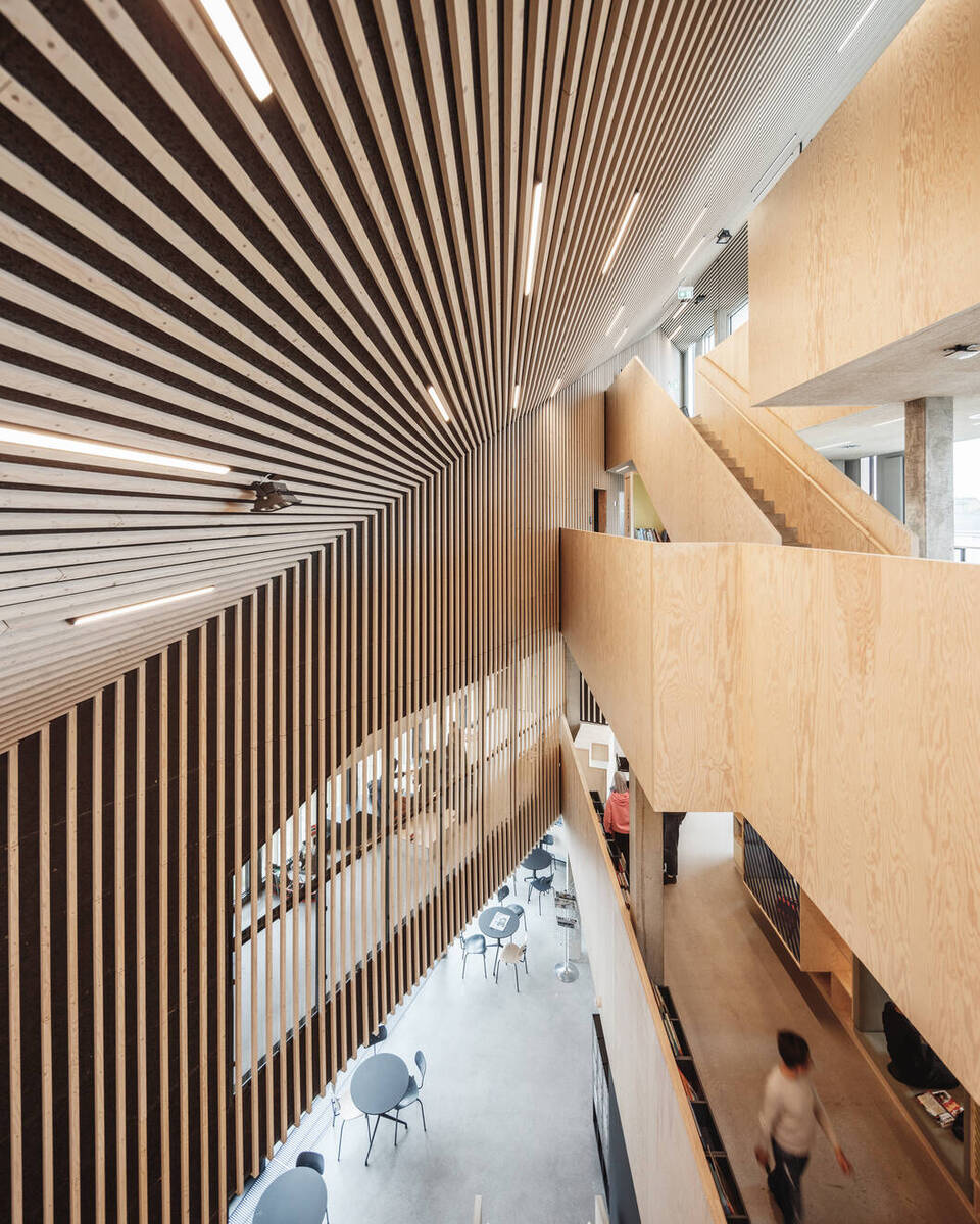 Yes, you've guessed it, the object with an unprecedented appearance is actually a library and a cultural center. Looking from a certain angle, you'll discover that it actually has a triangular shape and there's plenty of space in it. The overall size of the building is 1500 m2. It's all just an optical illusion. The tip of the wedge in its rear side is linked to the local school.