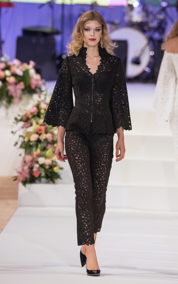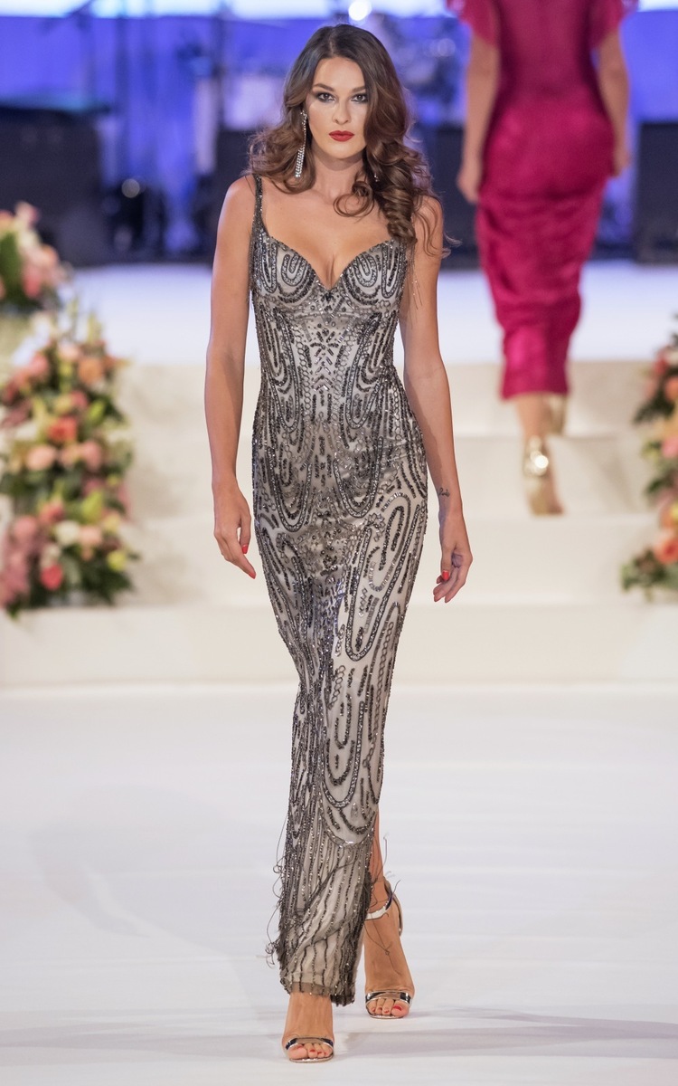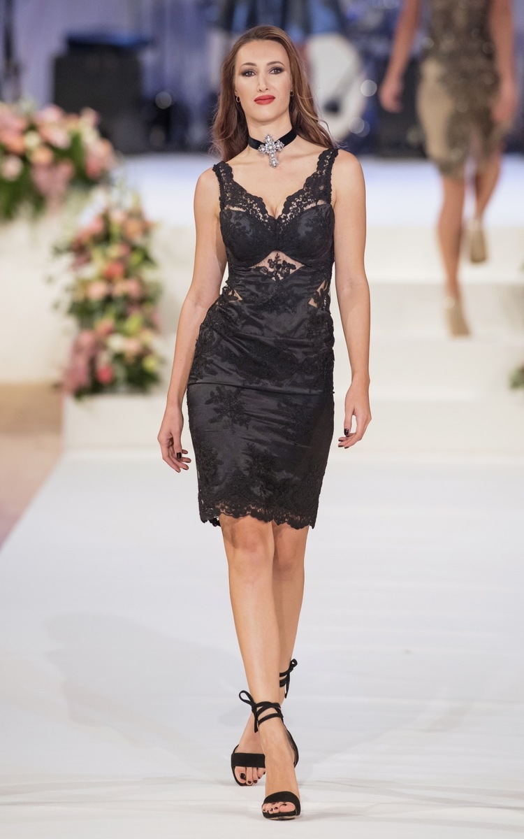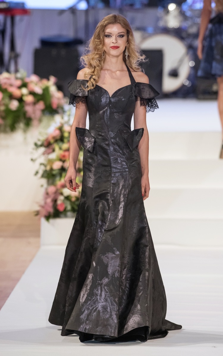 I thought the most beautiful model of all was the long fitted evening gown, worn by Nikol Švantnerová, with its soft champagne colour combined with the magnificent black stones, which were sewn on by hand....And I also admire the perfectly shaped décolletage, which the accurately adjusted cups also helped create. This may be just a detail, but it is one of the most important. To feel comfortable in a sexy dress and not have to constantly check the mirror to make sure that everything is still where it should be, that is what we all want. And that is why I give this model full marks.