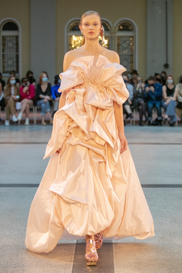 I believe that these materials are amazing, luxurious and lovely to touch. But this much fabric means you'll be carrying a lot of weight around, and who'd want to wear a pillow with a duvet? It certainly has its advantages, when you happen to get tired during the day, but the designer has recently mentioned that she reached the stage where she creates fashion for normal people. This definitely doesn't look normal to me. Can you imagine riding the tram in one of these?