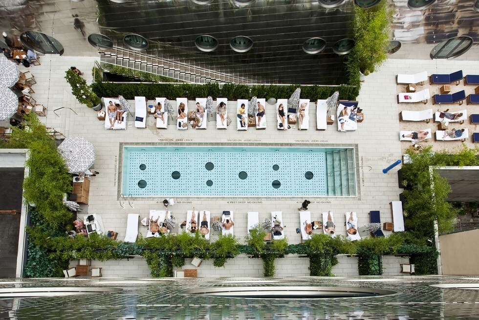 It will at first glance attract you by its exclusive front façade of stainless steel inspired by ocean lines and interesting window openings. Architect Frank Fusaro really showed off this time round. The tastefully finished, matching exterior of Dream Downtown reflects the famous seagoing era of the 1960's. The 12-storey building contains 316 rooms, two restaurants, roof VIP lounges as well as an outdoor swimming pool with a glass bottom.