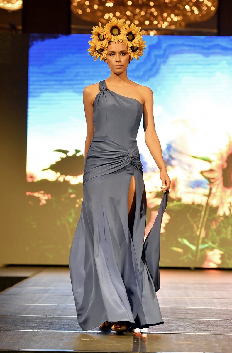 In her latest collection, Natali Ruden works primarily with the colors of the Ukrainian flag, so it is already dominated by blue and yellow. An integral part of all luxury models was a wreath with flowers, which is also an indispensable piece of traditional Ukrainian costumes.