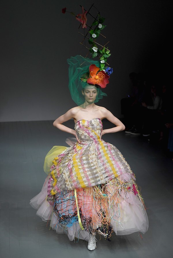 Most of all I was impressed by the "evening gown" if it is at all possible to describe it in these words, decorated with various drawstrings, tulle or tangled yarns. The most interesting of all was the giant hat resembling a hedge with growing shrubbery. The green netting over the face adds drama to the whole look. Yes, it is already clear, that it will not be the right thing for the Viennese Opera Ball; however, some crazy avant-garde party during the fashion week would certainly represent an original choice and opportunity.
