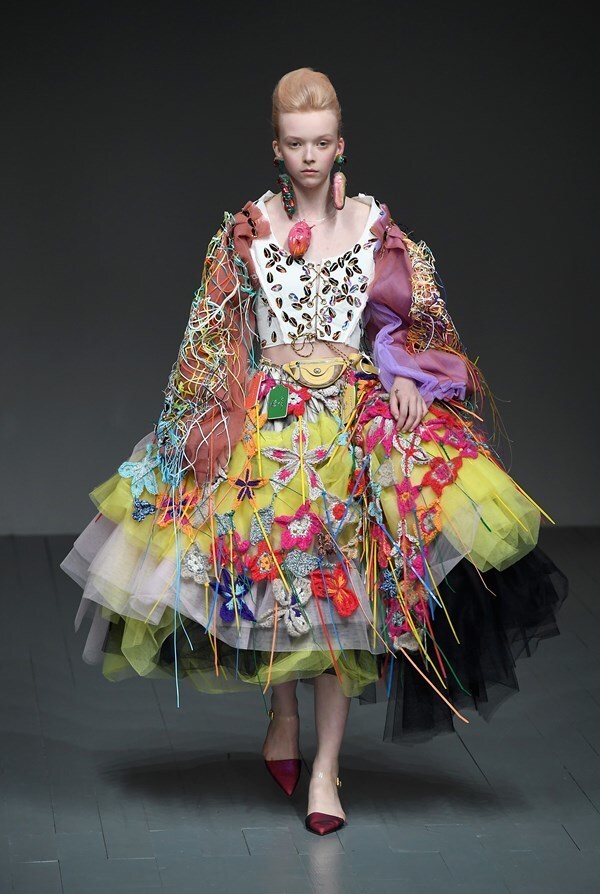 In the past, Matty Bovan also cooperated with luxury brands such as Louis Vuitton, Marc Jacobs or Miu Miu. In addition, he created a limited edition for Barbie in crochet style, vibrant colours, ruched skirts and bold applications. And it is the last three aspects that the designer employed in the luxury collection of SS19.