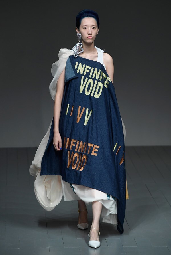 A great disappointment here for me was surprisingly a dress that was almost "normal". The denim one with a gold inscription INFINITE VOID. Which actually perfectly encapsulates the feeling from this model, which is something like endless emptiness...no original idea here.