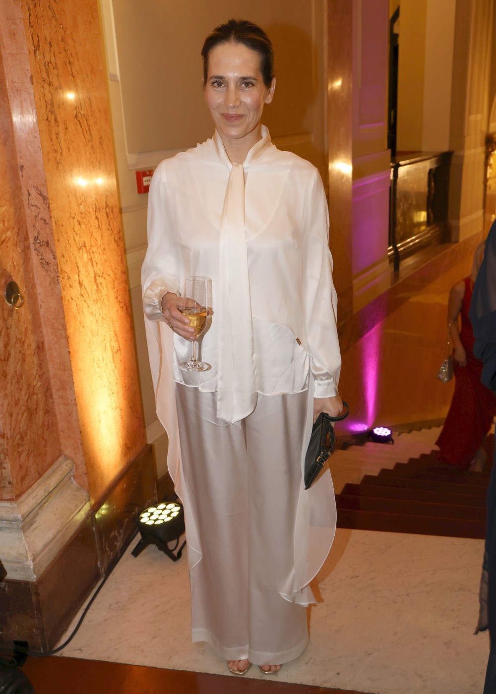 Při pohledu na herečku Janu Kolesárovou nás napadalo jen jedno slovo - únava. Jako by neměla svůj den a podle toho volila i svůj outfit, který měl být především nenápadný a pohodlný. Na druhou stranu ale působil velmi čistě, minimalisticky a možná maličko až étericky. Krémově bílý komplet s volnou halenkou a širokými kalhotami sází na jemnost a nenápadnou eleganci, která se na plesových akcích objevuje čím dál častěji. Vázanka u krku dodává modelu sofistikovaný nádech a lehce androgynní styl, což je zajímavý kontrast k tradičním večerním róbám.